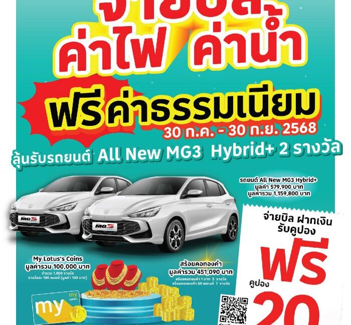 นอกจากนี้ ทุกการชำระบิลค่าน้ำประปา 1 รายการ ของสมาชิกมายโลตัส จะได้รับคูปองส่วนลดท้ายใบเสร็จ มูลค่า 20 บาท (จำกัดคูปอง 3 ใบ / สมาชิกมายโลตัส / วัน) สำหรับใช้ซื้อสินค้าของ Lotus’s ทุกสาขา ทั่วประเทศ (ยกเว้นช้อปออนไลน์) ในครั้งต่อไป (200 บาท ขึ้นไป / ใบเสร็จ / คูปอง) ตั้งแต่ บัดนี้ – 30 พฤศจิกายน 2568 พร้อมทั้งได้รับสิทธิ์ลุ้นโชค จำนวน 1,014 รางวัล มูลค่ารวมประมาณ 1,710,890 บาท (รางวัลที่ 1 รถยนต์ MG3 Hybrid+ จำนวน 2 รางวัล มูลค่ารางวัลละ 579,900 บาท รวมมูลค่า 1,159,800 บาท รางวัลที่ 2 สร้อยคอทองคำหนัก 1 บาท จำนวน 5 รางวัล มูลค่ารางวัลละ 52,950 บาท รวมมูลค่า 264,750 บาท รางวัลที่ 3 สร้อยคอทองคำหนัก 50 สตางค์ จำนวน 7 รางวัล มูลค่ารางวัลละ 26,620 บาท รวมมูลค่า 186,340 บาท รางวัลที่ 4 โลตัสคอยน์ 100 คอยน์ จำนวน 1,000 รางวัล มูลค่ารางวัลละ 100 บาท รวมมูลค่า 100,000 บาท) ประกาศรายชื่อผู้โชคดี ผ่านทางเว็บไซต์ Lotus’s ในวันที่ 16 ธันวาคม 2568 เวลา 18.00 น.
