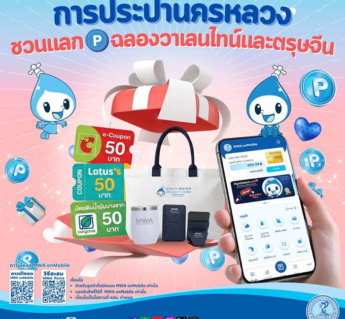 พิเศษสุด เพื่อฉลองเทศกาลวาเลนไทน์ และตรุษจีน เพียงใช้บริการออนไลน์หรือสมัคร MWA e-Bill Service ผ่านแอป MWA onMobile รับทันที MWA Point เพื่อสะสมคะแนนและนำไปแลกรับของรางวัล อาทิ e-Voucher และของที่ระลึกสุดพิเศษ โดยเริ่มรับสิทธิ์ได้ตั้งแต่วันที่ 16 กุมภาพันธ์ 2569 เวลา 10.00 น. เป็นต้นไป จนกว่าของรางวัลจะหมด (ของรางวัลมีจำนวนจำกัด)