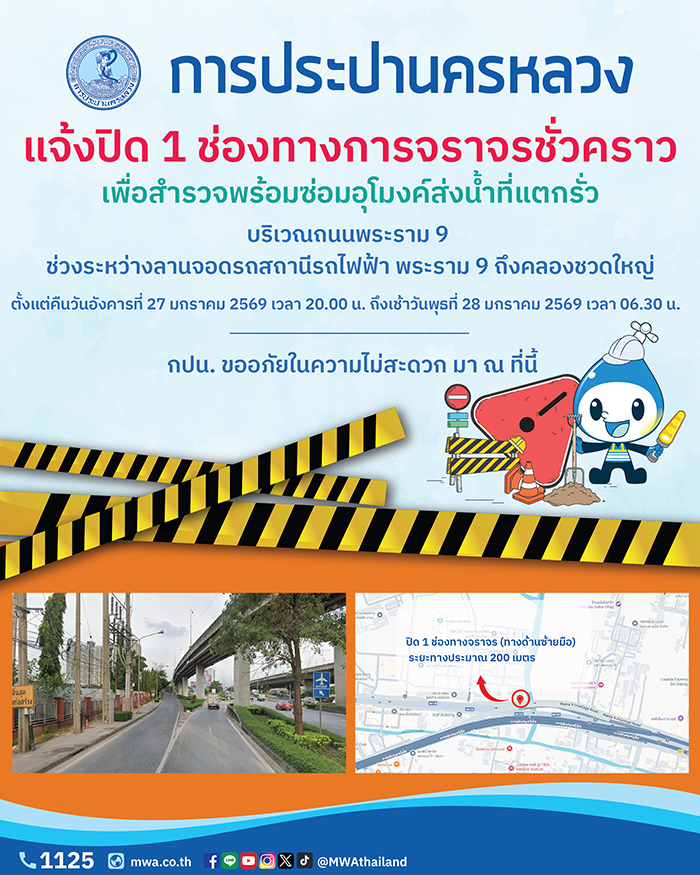 การประปานครหลวง (กปน.) แจ้งว่า กปน. มีความจำเป็นต้องดำเนินการสำรวจพร้อมซ่อมอุโมงค์ส่งน้ำขนาดเส้นผ่านศูนย์กลาง 2,000 มิลลิเมตร ที่แตกรั่ว บริเวณคลองชวดใหญ่ ถนนพระราม 9 จึงต้องขอปิดช่องทางการจราจร บริเวณถนนพระราม 9 ช่วงระหว่างลานจอดรถสถานีรถไฟฟ้า พระราม 9 (ไม่ปิดทางเข้า-ออกลานจอดรถ) ถึงคลองชวดใหญ่ รวมระยะทางประมาณ 200 เมตร จำนวน 1 ช่องทางจราจร (ทางด้านซ้ายมือ) ซึ่งประชาชนสามารถเลือกใช้ช่องทางการจราจรถัดไป (ช่องทางเดียวกันกับทางขึ้นทางพิเศษ) แล้วจึงเบี่ยงซ้ายกลับเข้าสู่ช่องทางดังกล่าว เมื่อพ้นคลองชวดใหญ่แล้ว หรือเลือกใช้ช่องทางการจราจรอื่น ๆ ได้ตามปกติ ตั้งแต่คืนวันนี้ (วันอังคารที่ 27 มกราคม 2569) ตั้งแต่เวลา 20.00 น. ถึงเวลา 06.30 น. ช่วงเช้าของวันพุธที่ 28 มกราคม 2569 โดย กปน. ได้จัดเจ้าหน้าที่คอยดูแลเส้นทางการจราจร พร้อมป้ายบอกทางไว้แล้ว ขออภัยในความไม่สะดวก มา ณ ที่นี้
