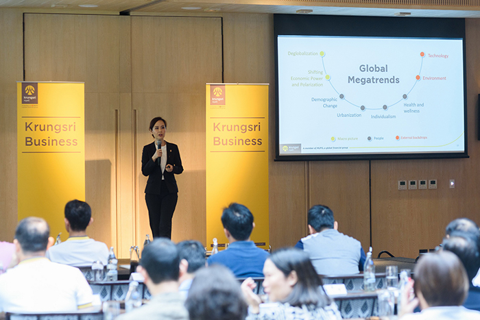 ด้าน ดร.พิมพ์นารา หิรัญกสิ ผู้บริหารฝ่ายวิจัยธุรกิจและอุตสาหกรรม ธนาคารกรุงศรีอยุธยา (จำกัด)มหาชน ได้ให้มุมมองเรื่อง Global Megatrends สำหรับปี 2566 ว่า ท่ามกลางการเปลี่ยนแปลงที่เกิดขึ้นอย่างรวดเร็ว ทำให้เกิดกระแสสำคัญที่ส่งผลกระทบต่อทั่วโลกรวมถึงประเทศไทย ประกอบไปด้วย 1. Deglobalization – หลายประเทศเริ่มเข้าสู่ภาวะ Regionalization นั่นคือการเชื่อมโยงกันเองในภูมิภาค สินค้าอุตสาหกรรมหลายประเภทหันมาพึ่งพาวัตถุดิบภายในภูมิภาคมากขึ้น 2. Shifting Economic Power and Polarization เริ่มมีการเปลี่ยนขั้วอำนาจทางเศรษฐกิจ โดยประเทศกลุ่มตลาดเกิดใหม่อย่างจีนและอินเดียเริ่มมีความสำคัญต่อภาวะเศรษฐกิจโลกมากขึ้น ขณะเดียวกันโลกต้องเผชิญกับความตึงเครียดในเชิงภูมิรัฐศาสตร์เพิ่มขึ้นและเป็นเรื่องที่ต้องเฝ้าติดตาม ซึ่งทั้ง 2 เรื่องนี้นำไปสู่การเปลี่ยนแปลงฐานการผลิต 3. Demographic Change การเปลี่ยนแปลงโครงสร้างประชากร โดยมีจำนวนผู้สูงอายุเพิ่มขึ้นทั่วโลก 4. Urbanization การเคลื่อนย้ายถิ่นฐานเข้าสู่เขตเมือง รวมถึงไลฟ์สไตล์ วิถีชีวิตเป็นแบบสังคมเมืองมากขึ้น 5. Individualism คนจะมองหาความแตกต่างที่เป็นเอกลักษณ์ของตัวเอง ต้องการสินค้าที่ทำมาเพื่อตัวเองโดยเฉพาะมากขึ้น 6. Health and Wellness คนให้ความสำคัญกับสุขภาพและความเป็นอยู่ที่ดีมากขึ้น 7. Environment เรื่องของสิ่งแวดล้อมกลายเป็นส่วนหนึ่งของชีวิตประจำวันและในระดับประเทศ 8. Technology เทคโนโลยีและนวัตกรรมต่างๆ จะเข้ามา Disrupt ธุรกิจและชีวิตประจำวันมากขึ้น ทั้งหมดนี้ นับเป็นความท้าทายที่ผู้ประกอบการต้องตระหนักและปรับเปลี่ยนกลยุทธ์การดำเนินธุรกิจให้สอดคล้องกับกระแสหรือโอกาสที่เกิดขึ้น เพื่อสร้างความเติบโตทางธุรกิจไปพร้อมกับการเติบโตทางเศรษฐกิจของไทย