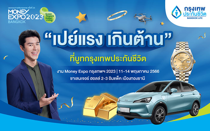 กรุงเทพประกันชีวิต ร่วมงาน “มหกรรมการเงินกรุงเทพ ครั้งที่ 23 หรือ Money Expo Bangkok 2023” ระหว่างวันที่ 11 – 14 พฤษภาคม 2566 ณ ชาเลนเจอร์ 2-3 อิมแพคเมืองทองธานี ยกขบวนผลิตภัณฑ์ประกันชีวิตที่หลากหลายและตอบโจทย์ ภายใต้แนวคิด “Happy Health, Happy Wealth ความสุขกับสุขภาพที่ดีและการเงินที่มั่งคั่ง” ที่มาพร้อมโปรสุดปัง “เปย์แรง เกินต้าน” เลือกรับไม่ต้องลุ้นกับรางวัลสูงสุด รถยนต์ไฟฟ้า นาฬิกา Rolex ทองคำ 15 บาท พบแบรนด์แอมบาสเดอร์สุดหล่อ “นาย ณภัทร” พร้อมกิจกรรมและของรางวัลมากมายตลอดงาน