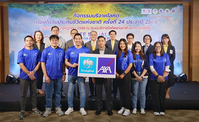 บมจ.กรุงไทย-แอกซ่า ประกันชีวิต นำโดย คุณกฤช ธีรสุข ประธานเจ้าหน้าที่บริหาร ฝ่ายตัวแทน (คนที่ 4 จากซ้ายแถวหน้า) พร้อมด้วยพนักงานและฝ่ายขายจิตอาสา เข้าร่วมบริจาคโลหิต เนื่องในวันประกันชีวิตแห่งชาติ ครั้งที่ 24 ประจำปี 2568 ณ สภากาชาดไทย ถนนอังรีดูนังต์ โดยกิจกรรมดังกล่าวเป็นความร่วมมือของสำนักงานคณะกรรมการกำกับและส่งเสริมการประกอบธุรกิจประกันภัย (คปภ.) สมาคมประกันชีวิตไทย สมาคมตัวแทนประกันชีวิตและที่ปรึกษาการเงิน พร้อมด้วยบริษัทประกันชีวิต 18 บริษัทชั้นนำ ซึ่งเป็นการจัดขึ้นเพื่อเป็นการแสดงความสามัคคีในร่วมกันแบ่งปันเพื่อสังคม และได้ช่วยเหลือผู้ป่วยทั่วประเทศ ที่สอดคล้องกับนโยบายหลักของบริษัทฯ ที่จะอยู่เคียงข้างทุกความเชื่อมั่นดูแลกันตลอดไป ท่านสามารถติดตามกิจกรรมดีๆ ของบริษัทฯ ได้ที่ www.krungthai-axa.co.th หรือ โทร 1159 หรือทางอีเมล customer.care@krungthai-axa.co.th