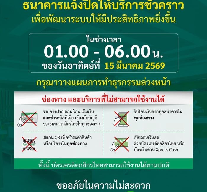 ธนาคารกสิกรไทยแจ้งปิดให้บริการชั่วคราว เพื่อพัฒนาระบบให้มีประสิทธิภาพยิ่งขึ้น ในวันอาทิตย์ที่ 15 มีนาคม 2569 เวลา 01:00 น. – 06:00 น. โดยช่องทางและบริการที่ไม่สามารถใช้งานได้ ดังนี้