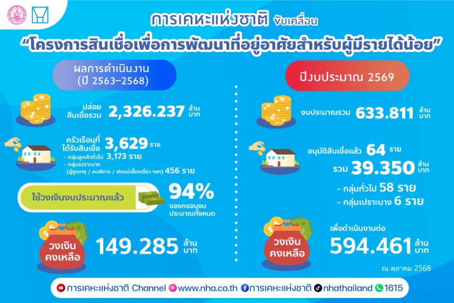 การเคหะแห่งชาติปล่อยสินเชื่อเพื่อการพัฒนาที่อยู่อาศัยสำหรับผู้มีรายได้น้อย ตั้งแต่ปี 2563–2568 รวมทั้งสิ้น 2,326.237 ล้านบาท ครอบคลุมจำนวนผู้ได้รับสินเชื่อ 3,629 ราย โดยใช้วงเงินงบประมาณแล้วกว่าร้อยละ 94 ของกรอบงบประมาณทั้งหมด คงเหลือวงเงิน 149.285 ล้านบาท ทั้งนี้แบ่งเป็นกลุ่มลูกค้าทั่วไป รวมจำนวน 3,173 ราย และกลุ่มเปราะบาง จำนวน 456 ราย ซึ่งรวมถึงผู้สูงอายุ คนพิการ และผู้มีรายได้น้อย สำหรับในปีงบประมาณ 2569 มีวงเงินงบประมาณในการปล่อยสินเชื่อ จำนวน 633.811 ล้านบาท ได้อนุมัติทำเช่าซื้อโครงการสินเชื่อแล้ว 64 ราย แบ่งเป็นกลุ่มลูกค้าทั่วไป 58 ราย และกลุ่มเปราะบาง 6 ราย เป็นจำนวนเงิน 39.350 ล้านบาท ซึ่งมีวงเงินงบประมาณคงเหลือ 594.461 ล้านบาท เพื่อรองรับการดำเนินงานในช่วงต่อไป