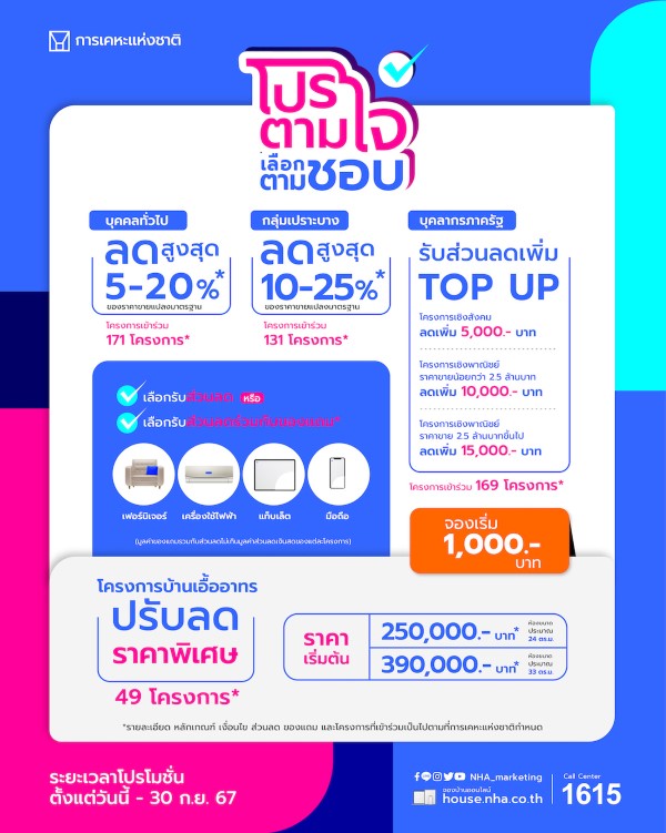 การเคหะแห่งชาติ ประกาศเชิญชวนครั้งสุดท้าย สำหรับคนอยากมีบ้านห้ามพลาด กับ “โปรตามใจเลือกตามชอบ” ที่ยกทัพโครงการที่อยู่อาศัยคุณภาพทั่วประเทศจำนวน 171 โครงการ มามอบส่วนลดสูงสุดถึง 25% ในราคาเริ่มต้นเพียง 250,000 บาท พร้อมเลือกรับของแถมแบบจุใจ อาทิ เฟอร์นิเจอร์ เครื่องใช้ไฟฟ้า แท็บเล็ต สมาร์ทโฟน สำหรับบุคลากรภาครัฐรับ Top up เพิ่มทันทีสูงสุด 15,000 บาท จองเริ่มต้นเพียง 1,000 บาท ผู้สนใจสามารถจับจองเป็นเจ้าของที่อยู่อาศัยคุณภาพ พร้อมข้อเสนอสุดพิเศษได้จนถึงวันที่ 30 กันยายนนี้เท่านั้น