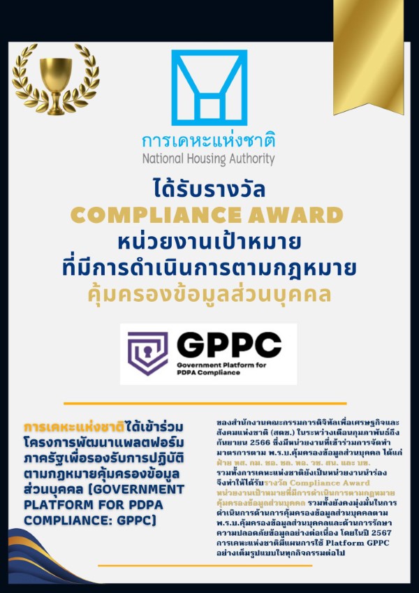 นายทวีพงษ์ วิชัยดิษฐ ผู้ว่าการการเคหะแห่งชาติ กล่าวว่า สำนักงานคณะกรรมการคุ้มครองข้อมูลส่วนบุคคล (สคส.) และสำนักงานคณะกรรมการดิจิทัลเพื่อเศรษฐกิจและสังคมแห่งชาติ (สดช.) ได้มอบรางวัล Compliance Award หน่วยงานเป้าหมายที่มีการดำเนินการตามกฎหมายคุ้มครองข้อมูลส่วนบุคคล (PDPA) ให้แก่การเคหะแห่งชาติ ซึ่งถือเป็นหน่วยงานนำร่องภายใต้โครงการพัฒนาแพลตฟอร์มภาครัฐ เพื่อรองรับการปฏิบัติตามกฎหมายคุ้มครองข้อมูลส่วนบุคคล (Government Platform for PDPA Compliance : GPPC)