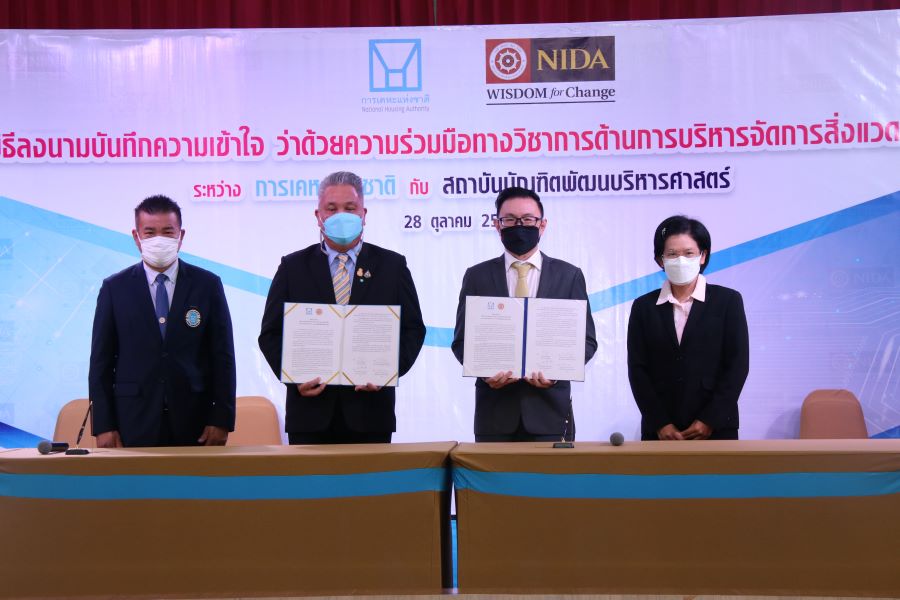 การเคหะแห่งชาติบูรณาการความร่วมมือกับสถาบันบัณฑิตพัฒนบริหารศาสตร์ (NIDA) ลงนามในบันทึกความเข้าใจว่าด้วยความร่วมมือทางวิชาการด้านการบริหารจัดการสิ่งแวดล้อม โดยมี นายทวีพงษ์ วิชัยดิษฐ ผู้ว่าการการเคหะแห่งชาติ และ ศาสตราจารย์ ดร.กำพล ปัญญาโกเมศ อธิการบดีสถาบันบัณฑิตพัฒนบริหารศาสตร์ ร่วมลงนามในบันทึกดังกล่าว พร้อมด้วย เรืออากาศโท ชัยรัตน์ ทองบริบูรณ์ รองผู้ว่าการการเคหะแห่งชาติ และศาสตราจารย์ ดร.วิสาขา ภู่จินดา คณบดีคณะบริหารการพัฒนาสิ่งแวดล้อม ร่วมเป็นสักขีพยาน เมื่อวันที่ 28 ตุลาคม 2564 ณ ห้องประชุมชั้น 3 อาคารสันทนาการ สำนักงานใหญ่ การเคหะแห่งชาติ แขวงคลองจั่น เขตบางกะปิ กรุงเทพฯ