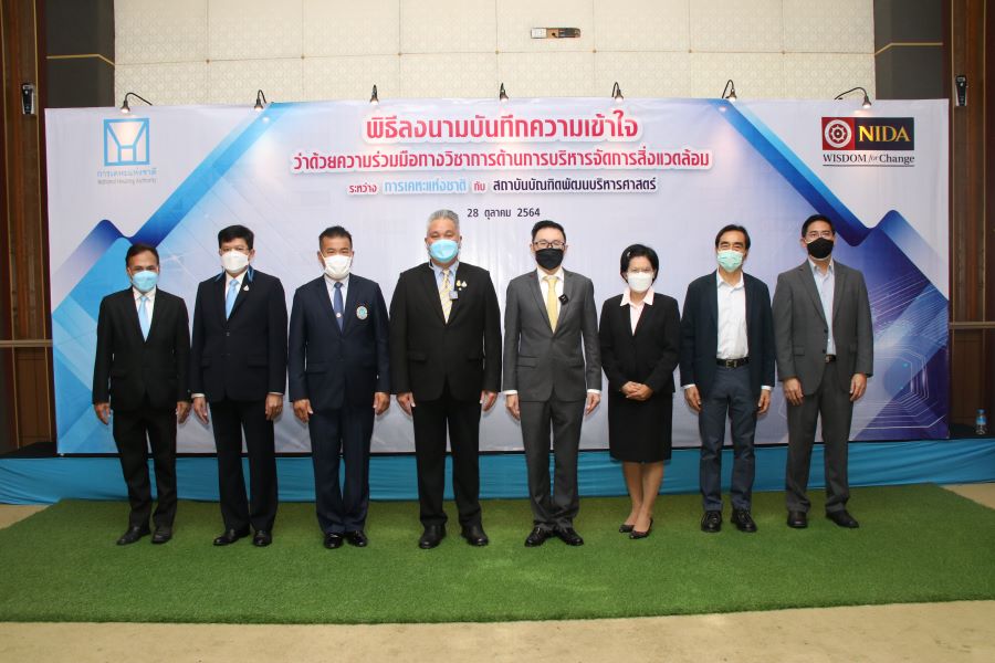 การเคหะแห่งชาติบูรณาการความร่วมมือกับสถาบันบัณฑิตพัฒนบริหารศาสตร์ (NIDA) ลงนามในบันทึกความเข้าใจว่าด้วยความร่วมมือทางวิชาการด้านการบริหารจัดการสิ่งแวดล้อม โดยมี นายทวีพงษ์ วิชัยดิษฐ ผู้ว่าการการเคหะแห่งชาติ และ ศาสตราจารย์ ดร.กำพล ปัญญาโกเมศ อธิการบดีสถาบันบัณฑิตพัฒนบริหารศาสตร์ ร่วมลงนามในบันทึกดังกล่าว พร้อมด้วย เรืออากาศโท ชัยรัตน์ ทองบริบูรณ์ รองผู้ว่าการการเคหะแห่งชาติ และศาสตราจารย์ ดร.วิสาขา ภู่จินดา คณบดีคณะบริหารการพัฒนาสิ่งแวดล้อม ร่วมเป็นสักขีพยาน เมื่อวันที่ 28 ตุลาคม 2564 ณ ห้องประชุมชั้น 3 อาคารสันทนาการ สำนักงานใหญ่ การเคหะแห่งชาติ แขวงคลองจั่น เขตบางกะปิ กรุงเทพฯ
