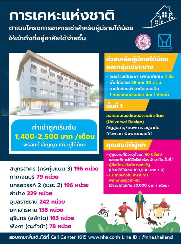 “โครงการอาคารเช่าสำหรับผู้มีรายได้น้อย” ปัจจุบันมีให้เลือกถึง 8 ทำเล ได้แก่ สมุทรสาคร กาญจนบุรี มหาสารคาม สุรินทร์ อุบลราชธานี นครสวรรค์ ลำปาง และพังงา ขนาดห้องพักอาศัยประมาณ 28 และ 30 ตารางเมตร อัตราค่าเช่าตั้งแต่ 1,400 – 2,500 บาท (ขึ้นอยู่กับที่ตั้งโครงการฯ) ซึ่งในแต่ละโครงการจะอยู่ใกล้กับสถานที่ราชการ แหล่งชุมชน ห้างสรรพสินค้าสามารถเดินทางและดำเนินชีวิตประจำวันได้อย่างสะดวกสบาย ขณะนี้ได้เปิดให้ประชาชนผู้มีรายได้น้อยลงทะเบียนจองสิทธิ์ “โครงการอาคารเช่าสำหรับผู้มีรายได้น้อย จังหวัดพังงา (ตะกั่วป่า)” ตั้งแต่วันนี้ จนถึงวันที่ 30 สิงหาคม 2565 โดยการเคหะแห่งชาติจะให้สิทธิ์ผู้สูงอายุและคนพิการสามารถเช่าห้องพักอาศัยในอาคาร ชั้นที่ 1 ก่อนเป็นอันดับแรก ซึ่งผู้สนใจจองสิทธิ์กรณีเป็นผู้ถือบัตรสวัสดิการแห่งรัฐจะต้องเป็นผู้มีรายได้ไม่เกิน 100,000 บาท/ปี กรณีประชาชนทั่วไป รวมถึงข้าราชการ/พนักงานรัฐวิสาหกิจ ต้องมีรายได้ไม่เกิน 30,000 บาท/เดือน