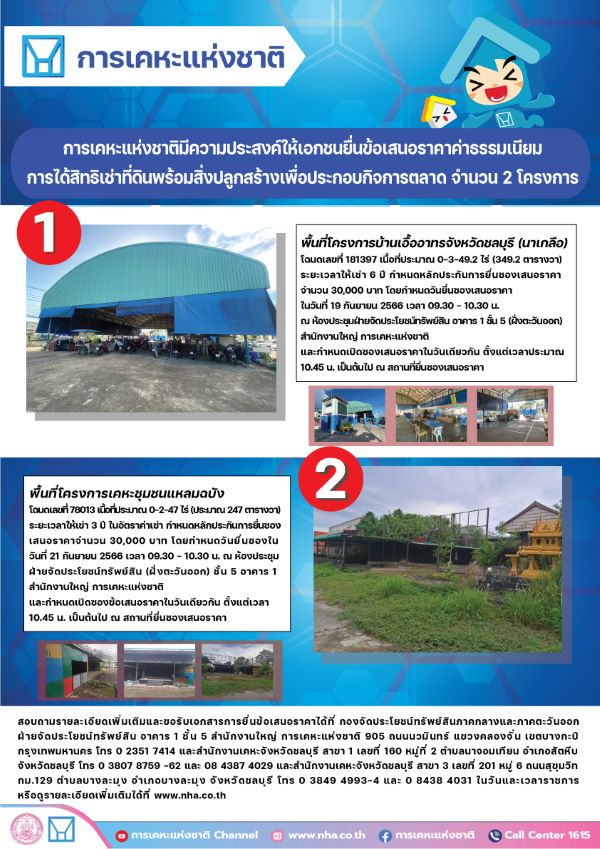 1. พื้นที่โครงการบ้านเอื้ออาทรจังหวัดชลบุรี (นาเกลือ) โฉนดเลขที่ 181397 เนื้อที่ประมาณ 0-3-49.2 ไร่ (349.2 ตารางวา) โดยมี รายละเอียดดังนี้ อัตราค่าธรรมเนียมการได้สิทธิเช่าขั้นต่ำไม่น้อยกว่า 250,000 บาท ระยะเวลาให้เช่า 6 ปี ในอัตราค่าเช่า ปีที่ 1 – 3 ไม่น้อยกว่าเดือนละ 16,500 บาท ปีที่ 4 – 6 ไม่น้อยกว่าเดือนละ 18,000 บาท กำหนดหลักประกัน การยื่นซองเสนอราคาจำนวน 30,000 บาท โดยกำหนดวันยื่นซองเสนอราคาในวันที่ 19 กันยายน 2566 เวลา 09.30 – 10.30 น. ณ ห้องประชุมฝ่ายจัดประโยชน์ทรัพย์สิน อาคาร 1 ชั้น 5 (ฝั่งตะวันออก) สำนักงานใหญ่ การเคหะแห่งชาติ และกำหนดเปิดซอง เสนอราคาในวันเดียวกัน ตั้งแต่เวลาประมาณ 10.45 น. เป็นต้นไป ณ สถานที่ยื่นซองเสนอราคา