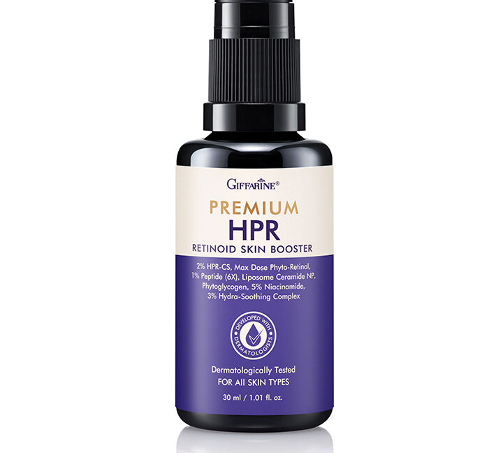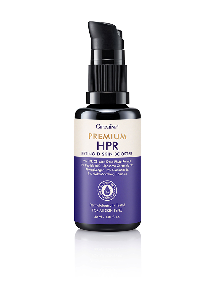 บริษัท กิฟฟารีน สกายไลน์ ยูนิตี้ จำกัด แนะนำไอเท็มเด็ด “กิฟฟารีน พรีเมียม เอชพีอาร์ เรตินอยด์ สกิน บูสเตอร์” (Giffarine Premium HPR Retinoid Skin Booster) ผลิตภัณฑ์ใหม่ในกลุ่มผลิตภัณฑ์บำรุงผิวหน้า (Skin Care For Face) ที่เป็นพรีเมียม เอชพีอาร์ สูตร Effective Dose มีจุดเด่นในเรื่องของความอ่อนโยน แต่ทรงประสิทธิภาพ ด้วยนวัตกรรม Hybrid Retinoids สูตรลับเฉพาะของกิฟฟารีนที่ผสานการทำงานระหว่าง 2% HPR-CS (New Gen-Retinoid Complex Solution) ซึ่งเท่ากับ HPR เข้มข้น 0.2% และ Max Dose Phyto-Retinol เสริมสร้างการผลิตเซลล์ผิวตามธรรมชาติ โดยไม่ทำลายชั้นผิว พร้อมสารเสริมลดการระคายเคือง เช่น Liposome Ceramide NP , 3% Hydra-Soothing Complex ที่รวม Natural Hyaluron 100% & Cica & Natural Betaine & Panthenol ฟื้นบำรุงผิวให้เรียบเนียน ชุ่มชื้น แลดูกระจ่างใส ลดเลือนริ้วรอย ผิวแลดูตึงกระชับ เมื่อใช้ต่อเนื่อง เหมาะสำหรับกลุ่มคนอายุ 25-50 ปีขึ้นไปทั้งผู้หญิง ผู้ชาย กลุ่มคนที่เริ่มมีริ้วรอยหรือกังวลเรื่องริ้วรอยก่อนวัย กลุ่มคนที่ให้ความสำคัญกับการดูแลผิวอีกระดับ และกลุ่มผู้เริ่มต้นหรือมือใหม่หัดใช้เรตินอยด์ เป็นต้น ขนาด 30 มล. ราคา 780 บาท