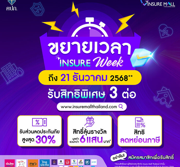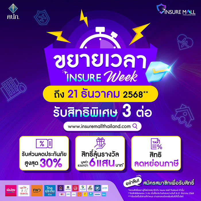 ต่อที่ 2: ลุ้นรางวัลใหญ่รวมมูลค่ากว่า 600,000 บาท มากกว่า 430 รางวัล สำหรับผู้ซื้อประกันภัยในช่วง Insure Week (8-21 ธันวาคม 2568) สิทธิ์ลุ้นรางวัลสงวนเฉพาะสมาชิก Insure Mall สมัครได้ที่ www.insuremallthailand.com