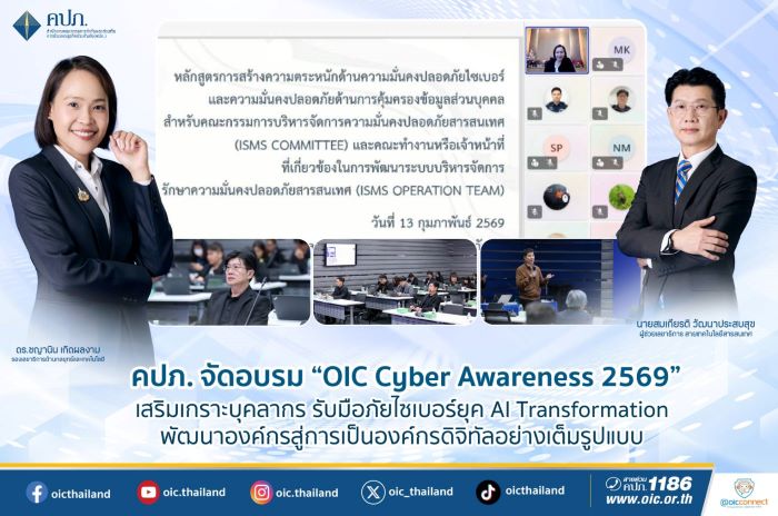 เมื่อวันที่ 13 กุมภาพันธ์ 2569 สำนักงานคณะกรรมการกำกับและส่งเสริมการประกอบธุรกิจประกันภัย (สำนักงาน คปภ.) จัดอบรมหลักสูตร “การสร้างความตระหนักด้านความมั่นคงปลอดภัยไซเบอร์และข้อมูลส่วนบุคคล (Cybersecurity and Personal Data Protection Awareness)” ในรูปแบบ Hybrid ทั้งผ่านระบบออนไลน์ และแบบ On-site ณ ห้องประชุมชั้น 2 อาคารสถาบันวิทยาการประกันภัยระดับสูง สำนักงาน คปภ. ถนนรัชดาภิเษก เพื่อวางรากฐานความเชื่อมั่นดิจิทัล (Digital Trust) และเตรียมความพร้อมของบุคลากรในการรับมือกับภัยคุกคามทางไซเบอร์ในยุค AI Transformation โดยได้รับเกียรติจากนางสาวชญานิน เกิดผลงาม รองเลขาธิการ ด้านกลยุทธ์และเทคโนโลยี เป็นประธานกล่าวเปิดงานผ่านระบบออนไลน์ พร้อมได้มอบนโยบายและ เตรียมความพร้อมให้แก่คณะทำงาน ISMS และเจ้าหน้าที่ที่เกี่ยวข้องในการรับมือกับภัยคุกคามทางไซเบอร์รูปแบบใหม่ พร้อมด้วยนายสมเกียรติ วัฒนาประสบสุข ผู้ช่วยเลขาธิการ สายเทคโนโลยีสารสนเทศ คณะทำงานบริหารจัดการความมั่นคงปลอดภัยสารสนเทศ (ISMS Working Group) และเจ้าหน้าที่ผู้ปฏิบัติงานที่เกี่ยวข้องของสำนักงาน คปภ. เข้าร่วม