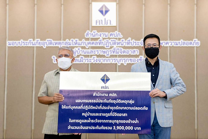 เมื่อวันที่ 13 พฤศจิกายน 2564 ดร.สุทธิพล ทวีชัยการ เลขาธิการคณะกรรมการกำกับและส่งเสริมการประกอบธุรกิจประกันภัย (เลขาธิการ คปภ.) เป็นประธานในพิธีมอบกรมธรรม์ประกันภัยอุบัติเหตุกลุ่มแก่บุคคลที่ปฏิบัติหน้าที่ประจำชุดรักษาความปลอดภัยหมู่บ้านและราษฎรที่มีจิตอาสาในการดูแลเฝ้าระวังจากการบุกรุกของช้างป่า ในตำบลสาลิกา อำเภอเมือง และตำบลนาหินลาด อำเภอปากพลี จังหวัดนครนายก เพื่อช่วยเหลือเยียวยาผู้ปฏิบัติภารกิจรักษาความปลอดภัยหมู่บ้านและการดูแลเฝ้าระวังจากการบุกรุกของช้างป่าที่มาทำความเสียหายต่อชีวิตและทรัพย์สินของประชาชนในพื้นที่ดังกล่าว โดยมีคณะผู้บริหาร ของสำนักงาน คปภ. ทั้งส่วนกลางและส่วนภูมิภาค และคณะผู้บริหาร ของจังหวัดนครนายก ร่วมส่งมอบกรมธรรม์จำนวน 39 ราย ให้กับนายอุดมเขต ราษฎร์นุ้ย รองผู้ว่าราชการจังหวัดนครนายก ณ โรงแรมรอยัล ฮิลล์ จังหวัดนครนายก ในโอกาสนี้ รองผู้ว่าราชการจังหวัดนครนายก กล่าวขอบคุณสำนักงาน คปภ. ที่สนับสนุนกรมธรรม์ประกันภัยอุบัติเหตุกลุ่มดังกล่าว ซึ่งการรับมอบในครั้งนี้ มีคุณค่าและเป็นประโยชน์อย่างยิ่งในการนำระบบประกันภัยเป็นเครื่องมือในการบริหารความเสี่ยงภัยให้กับอาสาสมัครผู้ปฏิบัติภารกิจในพื้นที่ โดยไม่มีค่าตอบแทนและสวัสดิการใด ๆ รองรับ อีกทั้งเป็นการสร้างขวัญกำลังใจให้กับอาสาสมัครได้อุ่นใจในขณะปฏิบัติงานรักษา ความปลอดภัยหมู่บ้านและการดูแลเฝ้าระวังจากการบุกรุกของช้างป่าอีกด้วย