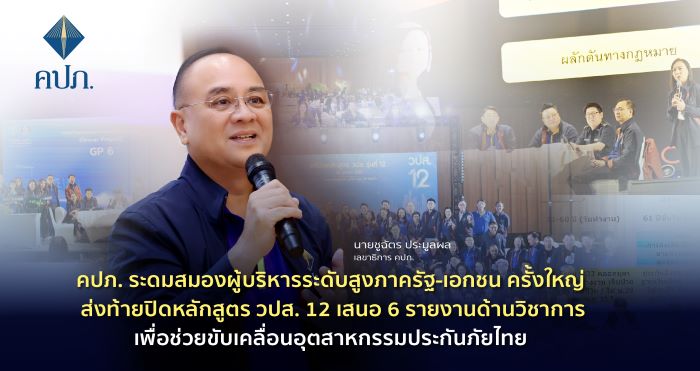 นายชูฉัตร ประมูลผล เลขาธิการคณะกรรมการกำกับและส่งเสริมการประกอบธุรกิจประกันภัย (เลขาธิการ คปภ.) เป็นประธานในพิธีปิดการศึกษาอบรมหลักสูตรวิทยาการประกันภัยระดับสูง (วปส.) รุ่นที่ 12 ประจำปี 2567 จัดขึ้นระหว่างวันที่ 25-27 ตุลาคม 2567 ณ Pullman Phuket Karon Beach Resort จังหวัดภูเก็ต โดยหลักสูตรดังกล่าวมีผู้เข้าอบรมประกอบด้วยผู้บริหารระดับสูงจากหน่วยงานภาครัฐ ภาคเอกชน และธุรกิจประกันภัย จำนวนทั้งสิ้น 144 คน ซึ่งตลอดหลักสูตรมีการอบรม แลกเปลี่ยนข้อคิดเห็นในชั้นเรียนและเข้าศึกษาดูงานทั้งในและต่างประเทศ รวมทั้งร่วมทำกิจกรรมความรับผิดชอบต่อสังคม (Corporate Social Responsibility : CSR) ตลอดจนจัดทำรายงานการศึกษากลุ่ม (Group Project : GP) ในหัวข้อต่าง ๆ ที่เป็นประโยชน์ต่อระบบประกันภัยของไทยอีกด้วย