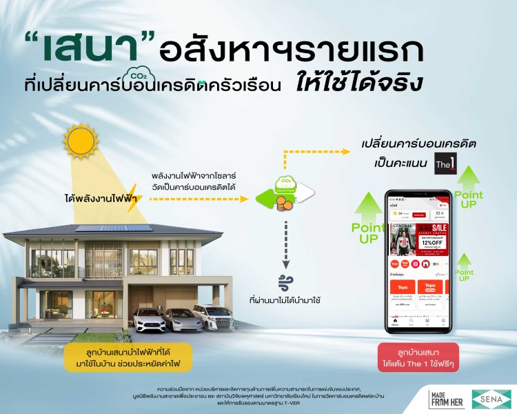 เสนาเดินหน้าตอกย้ำความเป็นผู้นำบ้านโซลาร์เซลล์อีกครั้ง กับปรากฏการณ์ครั้งแรกของวงการอสังหาฯ ลูกบ้านเสนาสามารถเปลี่ยนคาร์บอนเครดิตครัวเรือนให้มีมูลค่า นำไปใช้เป็นส่วนลดหรือซื้อสินค้าได้จริง….เสนา ดีเวลลอปเม้นท์ ร่วมโครงการตลาดคาร์บอนครัวเรือน ภาคสมัครใจ โดยความร่วมมือระหว่างมูลนิธิพลังงานสะอาดเพื่อประชาชน (มพช.), หน่วยบริหารและจัดการทุนด้านการเพิ่มความสามารถในการแข่งขันของประเทศ (บพข.), สถาบันวิจัยพหุศาสตร์ มหาวิทยาลัยเชียงใหม่ และ กลุ่มเซ็นทรัล The 1 Card ในการนำคาร์บอนเครดิตครัวเรือน มาแลกเป็นคะแนน The 1 ได้ฟรี