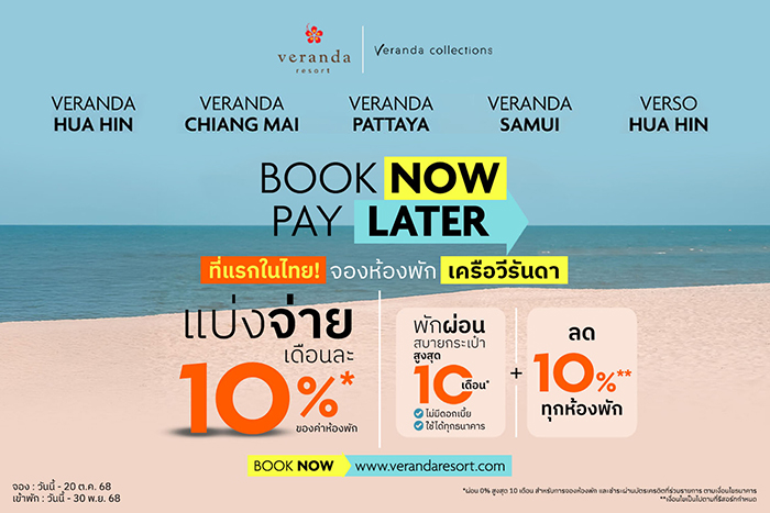 “ภวัฒภ์ องค์วาสิฏฐ์” ซีอีโอ บมจ.วีรันดา รีสอร์ท หรือ VRANDA ผู้ประกอบการโรงแรมและรีสอร์ทภายใต้แบรนด์วีรันดา จัดแคมเปญ ‘Book Now, Pay Later’ ชวนเก็บกระเป๋าไปฮีลใจก่อนแล้วค่อยแบ่งจ่ายค่าห้องแบบสบายๆ ดอกเบี้ย 0% นานสูงสุด 10 เดือน ผ่านบัตรเครดิตที่ร่วมรายการ โดยไม่มีขั้นต่ำ ซึ่งยังไม่มีโรงแรมไหนเคยให้ขนาดนี้ นอกจากนี้ยังมีส่วนลด On-Top เพิ่มอีก 10% ทุกการจองห้องพักในเครือฯ ทั้งวีรันดา รีสอร์ท และวีรันดา คอลเลกชัน ผ่านเว็บไซต์ www.verandaresort.com เรียกได้ว่าใจป้ำสุดๆ ถือเป็นผู้ประกอบการโรงแรมเจ้าแรกที่ให้ลูกค้าผ่อนได้ยาวๆ โดยไม่มีดอกเบี้ย ช่วยให้คนไทยเที่ยวได้ง่ายขึ้น สายเที่ยวคนไหนที่ปักหมุดเช็คอินโรงแรมหรือรีสอร์ทในเครือวีรันดาฯไว้ในใจต้องรีบหน่อย เพราะเปิดให้จองได้ตั้งแต่วันนี้ -20 ต.ค.นี้ และเข้าพักได้ถึง 30 พ.ย. 2568 เท่านั้น! (ยกเว้น วีรันดา รีสอร์ท ภูเก็ต และเงื่อนไขเป็นไปตามที่ธนาคารและรีสอร์ทกำหนด)
