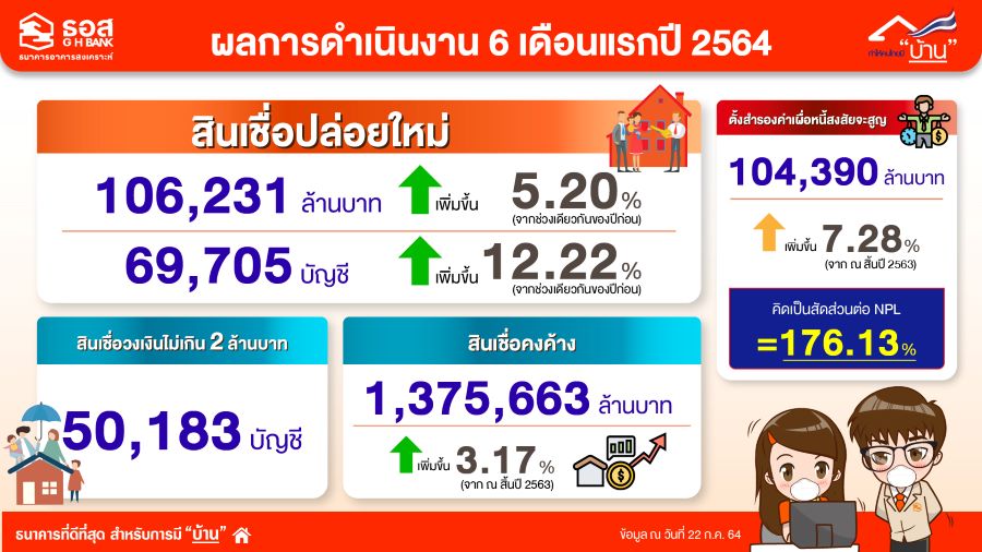 นายฉัตรชัย ศิริไล กรรมการผู้จัดการ ธนาคารอาคารสงเคราะห์ (ธอส.) เปิดเผยถึงผลการดำเนินงาน ณ ไตรมาสที่ 2 ของปี 2564 ว่า แม้ประเทศไทยจะยังคงอยู่ในสถานการณ์การแพร่ระบาดของเชื้อไวรัสโคโรนา 2019 (COVID-19) ที่ส่งผลต่อภาพรวมเศรษฐกิจ และรายได้ของประชาชน แต่ ธอส. ยังคงสามารถทำหน้าที่ตามพันธกิจ “ทำให้คนไทยมีบ้าน” เพื่อสนับสนุนให้ประชาชนได้มีที่อยู่อาศัยเป็นของตนเองได้อย่างต่อเนื่อง ณ วันที่ 30 มิถุนายน 2564 ธนาคารปล่อยสินเชื่อใหม่ได้ 106,231 ล้านบาท 69,705 บัญชี เพิ่มขึ้น 5.20% จากช่วงเดียวกันของปี 2563 คิดเป็นเกือบ 50% ของเป้าหมายปล่อยสินเชื่อใหม่ปี 2564 ที่ 215,641 ล้านบาท สินเชื่อ 6 เดือนแรก ที่ปล่อยไปเป็นสินเชื่อที่มีวงเงินกู้ไม่เกิน 2 ล้านบาท สำหรับกลุ่มผู้มีรายได้น้อยและปานกลางจำนวน 50,183 บัญชี ธนาคารมียอดสินเชื่อคงค้างรวมทั้งสิ้น 1,375,663 ล้านบาท เพิ่มขึ้น 3.17% สินทรัพย์รวม 1,441,928 ล้านบาท เพิ่มขึ้น 2.46% เงินฝากรวม 1,205,886 ล้านบาท เพิ่มขึ้น 3.81% หนี้ที่ไม่ก่อให้เกิดรายได้ (NPL) จำนวน 59,268 ล้านบาท คิดเป็น 4.31% ของยอดสินเชื่อรวม เพิ่มขึ้นเล็กน้อยจากสิ้นปี 2563 ที่มี NPL อยู่ที่ 3.75% ของสินเชื่อรวม โดยมีการตั้งสำรองเผื่อหนี้สงสัยจะสูญที่ 104,390 ล้านบาท คิดเป็นสัดส่วนต่อ NPL สูงถึง 176.13% เพื่อความมั่นคงและเตรียมพร้อมรองรับผลกระทบจาก COVID-19 ในอนาคต โดยธนาคารยังคงมีกำไรสุทธิตามเป้าหมายตัวชี้วัดของธนาคารที่ 5,993 ล้านบาท และมีอัตราส่วนเงินกองทุนต่อสินทรัพย์เสี่ยง (BIS Ratio) ในระดับแข็งแกร่งที่ 15.63% สูงกว่าอัตราเงินกองทุนขั้นต่ำที่ธนาคารแห่งประเทศไทยกำหนด