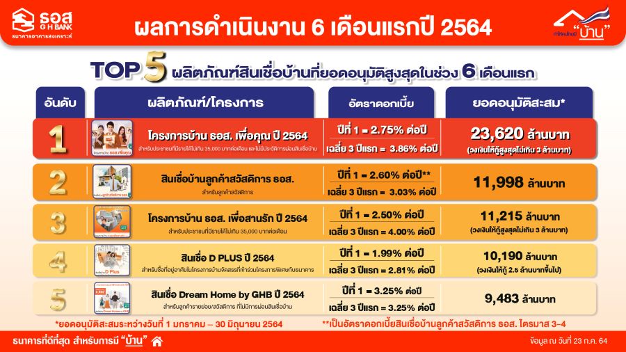 ทั้งนี้ ปัจจัยหลักที่ธนาคารยังคงปล่อยสินเชื่อใหม่ได้อย่างต่อเนื่อง คือ มาตรการต่างๆ ของรัฐบาล ผลิตภัณฑ์สินเชื่ออัตราดอกเบี้ยต่ำของธนาคาร และการจัดโปรโมชั่นของผู้ประกอบการ ช่วยให้ประชาชนกลุ่มที่ไม่ได้รับผลกระทบจาก COVID-19 มีบ้านเป็นของตนเองและครอบครัวได้ง่ายขึ้น โดยผลิตภัณฑ์สินเชื่อของ ธอส. ที่มีลูกค้าเลือกใช้บริการสูงสุด 3 ลำดับแรก คือโครงการบ้าน ธอส. เพื่อคุณ อัตราดอกเบี้ยปีแรกเพียง 2.75% ต่อปี มียอดอนุมัติสะสมสูงถึง 23,620 ล้านบาท รองลงมาคือสินเชื่อบ้านลูกค้าสวัสดิการ ธอส. ปัจจุบันอัตราดอกเบี้ยปีแรก 2.60% ต่อปี มียอดอนุมัติสะสม 11,998 ล้านบาท และโครงการบ้าน ธอส. เพื่อสานรัก อัตราดอกเบี้ยปีแรก 2.50% ต่อปี มียอดอนุมัติสะสม 11,215 ล้านบาท