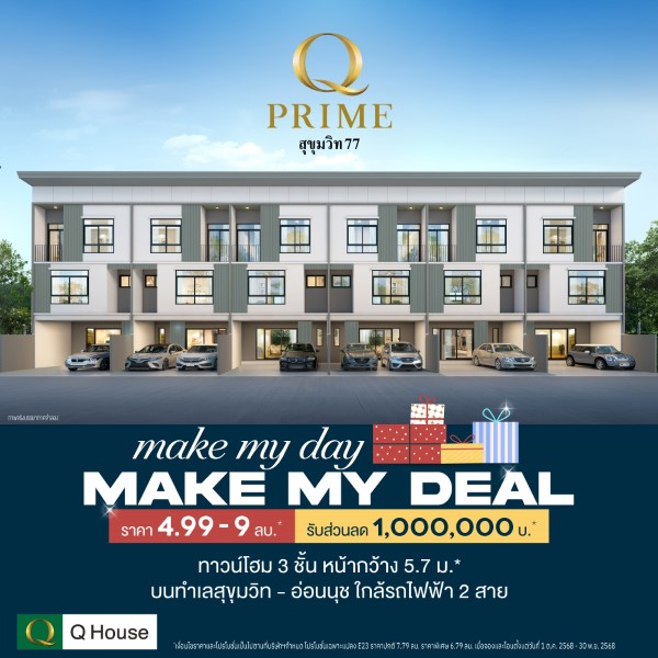 บริษัท ควอลิตี้เฮ้าส์ จำกัด (มหาชน) เปิดเผยว่า ล่าสุดได้จัดแคมเปญเพื่อกระตุ้นยอดขายโค้งสุดท้าย ไตรมาส 4 ปี 2568 กับโปรโมชัน “MAKE MY DAY MAKE MY DEAL” มอบสิทธิพิเศษให้กับลูกค้า รับส่วนลดมูลค่าตั้งแต่ 200,000 – 2,000,000 บาท* กับโครงการบ้านพร้อมอยู่ ทั้งบ้านเดี่ยว บ้านแฝด และทาวน์โฮม รวม 45 โครงการ ภายใต้แบรนด์ ลัดดารมย์ วรารมย์ คาซ่า Q Prime Q District และ กัสโต้ ของบริษัทฯและบริษัทในเครือ บนทำเลศักยภาพ กรุงเทพ ปริมณฑล ชลบุรี และเชียงใหม่ ราคา 3 – 28 ล้านบาท เมื่อจองและโอนตั้งแต่วันนี้ – 30 พ.ย. 2568 เท่านั้น*