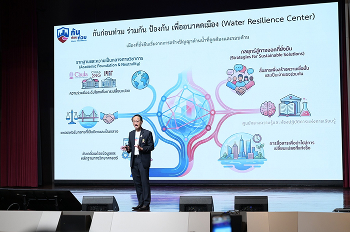 ศาสตราจารย์พิเศษ ดร.สุรเกียรติ์ เสถียรไทย นายกสภาจุฬาลงกรณ์มหาวิทยาลัย กล่าวเปิดงานว่า ภัยน้ำไม่ใช่เพียงความเสียหายต่อบ้านเรือนหรือทรัพย์สิน แต่คือการทำลาย “ชีวิตทั้งชีวิต” ทั้งโอกาสทางการศึกษา สุขภาพจิตครอบครัว ซ้ำเติมความเหลื่อมล้ำและความมั่นคงของสังคม หากเกิดอุทกภัยในพื้นที่เศรษฐกิจชั้นในอย่างกรุงเทพมหานคร ซึ่งเป็นศูนย์กลางเศรษฐกิจของประเทศ จะสร้างผลกระทบทางเศรษฐกิจสูงถึง 10 ล้านบาทต่อนาที และก่อให้เกิดผลกระทบทางสังคมที่ไม่อาจประเมินค่า