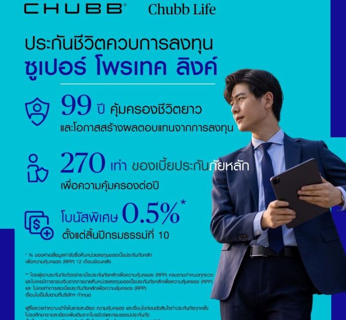 สำหรับผู้ที่สนใจผลิตภัณฑ์ประกันชีวิตควบการลงทุน “ซูเปอร์ โพรเทค ลิงค์” จาก ชับบ์ ไลฟ์ ประกันชีวิต สามารถดูรายละเอียดเพิ่มเติมได้ที่ https://www.chubb.com/th-th/personal/unit-linked.html หรือติดต่อตัวแทนฯ ชับบ์ ไลฟ์ ประกันชีวิต ทั่วประเทศ