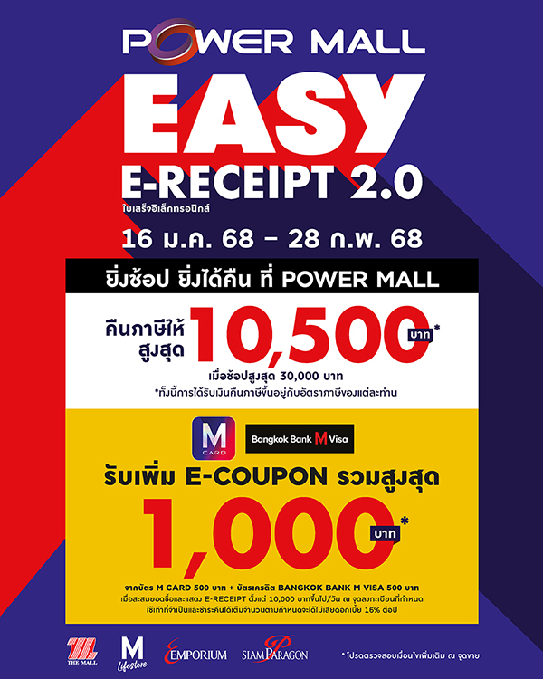 สำหรับลูกค้าที่ใช้จ่ายในช่วงมาตรการ Easy E-Receipt 2.0 นอกจากสามารถรับสิทธิได้ลดหย่อนภาษีตามมาตรการแล้ว ยังสามารถรับเพิ่มคูปองอิเล็กทรอนิกส์ (E-Coupon) ผ่าน M Card Application รวมสูงสุด 1,000 บาท พิเศษสำหรับสมาชิกบัตร M Card และลูกค้าบัตรเครดิต BANGKOK BANK M VISA เมื่อแสดงใบเสร็จอิเล็กทรอนิกส์ (E-Receipt) ที่สะสมยอดช้อปปิ้งภายในห้างฯและศูนย์ฯ เดอะมอลล์, เดอะมอลล์ ไลฟ์สโตร์ ทุกสาขา, ห้างสรรพสินค้าเอ็มโพเรียม, เอ็มควอเทียร์, เอ็มสเฟียร์ และพารากอน ดีพาร์ทเม้นท์สโตร์ ครบ 10,000 บาท ขึ้นไป/วัน (รวม Power Mall, Gourmet Market, Home Fresh Mart และGourmet Eats เฉพาะร้านค้าที่สามารถออกใบเสร็จอิเล็กทรอนิกส์ ได้ภายในวันเดียวกันเท่านั้น)