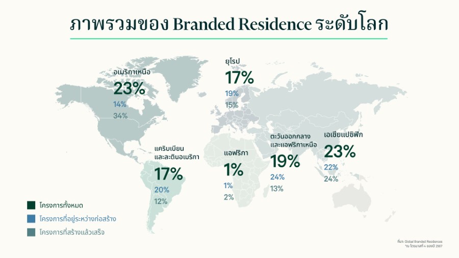 ปัจจุบันภูมิภาคเอเชียแปซิฟิก (APAC) กำลังก้าวขึ้นเป็นศูนย์กลางสำคัญของ Branded Residence อย่างน่าจับตา โดยมีสัดส่วนการครองตลาดของโครงการที่สร้างแล้วเสร็จในเอเชียแปซิฟิกอยู่ที่ 24% ตามหลังอเมริกาเหนือ ซึ่งมีส่วนแบ่ง 34% ทั้งนี้ เมื่อพิจารณาโครงการที่สร้างแล้วเสร็จและโครงการที่อยู่ในระหว่างก่อสร้าง (Pipeline) คาดการณ์ว่าทั้งสองภูมิภาคจะมีส่วนแบ่งตลาดที่เท่ากันที่ 23% ซึ่งสะท้อนถึงศักยภาพการเติบโตอย่างแข็งแกร่งของเอเชียแปซิฟิก