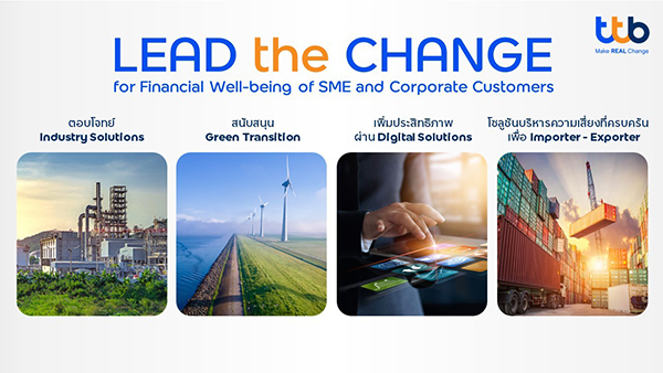 นายศรัณย์ ภู่พัฒน์ ประธานเจ้าหน้าที่บริหารลูกค้าธุรกิจ ทีเอ็มบีธนชาต เปิดเผยว่า ทีทีบีมุ่งมั่นพัฒนาผลิตภัณฑ์และบริการ เพื่อส่งมอบประสบการณ์ที่ดีอย่างต่อเนื่องแก่เอสเอ็มอีและลูกค้าธุรกิจให้มีชีวิตทางการเงินที่ดีขึ้นในทุกด้าน ด้วยแนวคิดการมองลูกค้าเป็น 360 องศา โดยมี ttb business one ธนาคารดิจิทัลเพื่อโลกธุรกิจ เป็นแพลตฟอร์มหลักในการเชื่อมต่อดิจิทัลโซลูชันทางธุรกิจ สำหรับในปี 2567 นี้ ทีทีบีเดินหน้า LEAD the CHANGE for Financial Well-being of SME and Corporate Customers เป็นผู้นำในการสร้างโซลูชันที่ตอบโจทย์ซัพพลายเชนของแต่ละอุตสาหกรรมสำหรับธุรกิจทั้งในประเทศและระหว่างประเทศ พร้อมสนับสนุนลูกค้าสู่การเปลี่ยนผ่านธุรกิจสู่ความยั่งยืน ตลอดจนยกระดับการทำธุรกรรมทางธุรกิจสู่ดิจิทัลเต็มรูปแบบ ด้วย 4 กลยุทธ์ ได้แก่