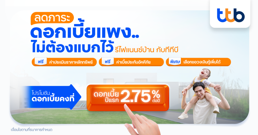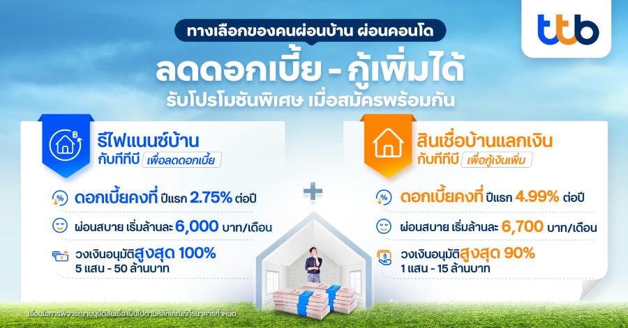 ทีเอ็มบีธนชาต หรือ ทีทีบี ตอกย้ำพันธกิจช่วยให้ “คนมีบ้าน” มีชีวิตทางการเงินดีขึ้น ส่งสินเชื่อบ้านรีไฟแนนซ์เป็นโซลูชันช่วยลูกค้าผ่อนหนักให้เป็นเบาในช่วงภาวะดอกเบี้ยขาขึ้น ลดภาระดอกเบี้ย ยอดผ่อนต่อเดือนลดลง พร้อมโปรโมชันดอกเบี้ยพิเศษ ทั้งแบบคงที่และลอยตัว เฉลี่ย 3 ปีแรกเริ่มต้น 3.25% ต่อปี ผ่อนเบาเริ่มต้นล้านละ 6,000 บาท/เดือน ฟรีค่าใช้จ่ายต่าง ๆ ช่วยลูกค้าประหยัดเงิน พิเศษ! ขอวงเงินกู้เพิ่ม ไว้เสริมสภาพคล่องได้อีกด้วย