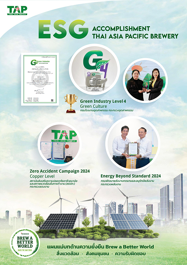 บริษัท ไทยเอเชีย แปซิฟิค บริวเวอรี่ จำกัด (ทีเอพี) ตอกย้ำความสำเร็จด้านความยั่งยืนจากการดำเนินธุรกิจภายใต้แผนแม่บท “Brew a Better World” คว้ารางวัลคุณภาพจากหน่วยงานภาครัฐ ได้แก่ รางวัลมาตรฐาน “อุตสาหกรรมสีเขียว ระดับที่ 4: วัฒนธรรมสีเขียว (Green Culture)” จากกระทรวงอุตสาหกรรม ประกาศนียบัตรเจตนารมณ์อนุรักษ์พลังงาน (Energy Beyond Standards 2024) จากกรมพัฒนาพลังงานทดแทนและอนุรักษ์พลังงาน กระทรวงพลังงาน และโล่ประกาศเกียรติคุณกิจกรรมการรณรงค์ลดสถิติอุบัติเหตุจากการทำงานให้เป็นศูนย์ (Zero Accident Campaign) จากสถาบันส่งเสริมความปลอดภัยอาชีวอนามัย และสภาพแวดล้อมในการทำงาน (สปปท.) กระทรวงแรงงาน