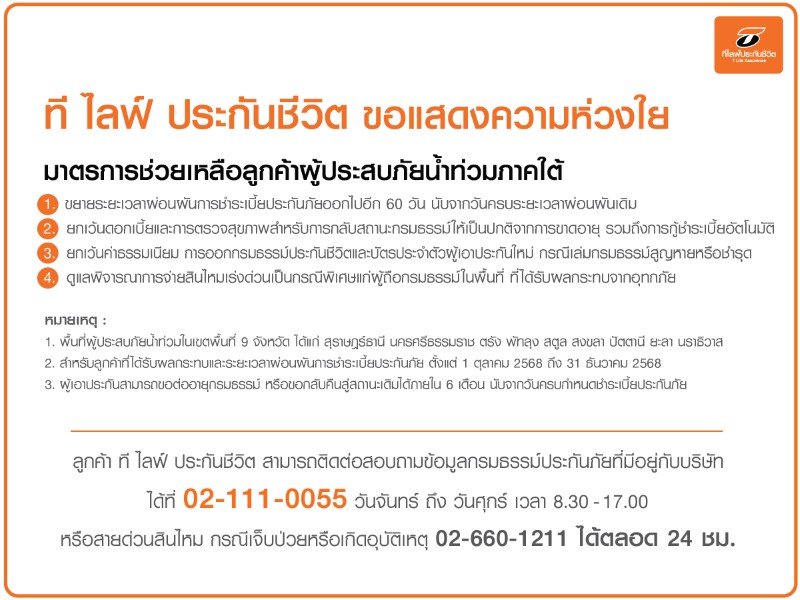 บริษัท ที ไลฟ์ ประกันชีวิต จำกัด (มหาชน) ขอแสดงความห่วงใยต่อผู้ประสบอุทกภัยในพื้นที่ภาคใต้ และตระหนักถึงผลกระทบที่ลูกค้าผู้เอาประกันภัยได้รับจากสถานการณ์น้ำท่วมครั้งนี้ เพื่อบรรเทาความเดือดร้อนและช่วยลดภาระ จึงได้ออกมาตรการช่วยเหลือเป็นการเร่งด่วน โดยขยายระยะเวลาผ่อนผันการชำระเบี้ยประกันภัยออกไปอีก 60 วัน นับจากวันครบกำหนดผ่อนผันเดิม พร้อมทั้งยกเว้นดอกเบี้ยและการตรวจสุขภาพสำหรับการกลับสถานะกรมธรรม์ที่ขาดอายุ รวมถึงกรณีที่มีการกู้ชำระเบี้ยอัตโนมัติ เพื่อให้ผู้เอาประกันสามารถรักษาความคุ้มครองได้อย่างต่อเนื่อง
