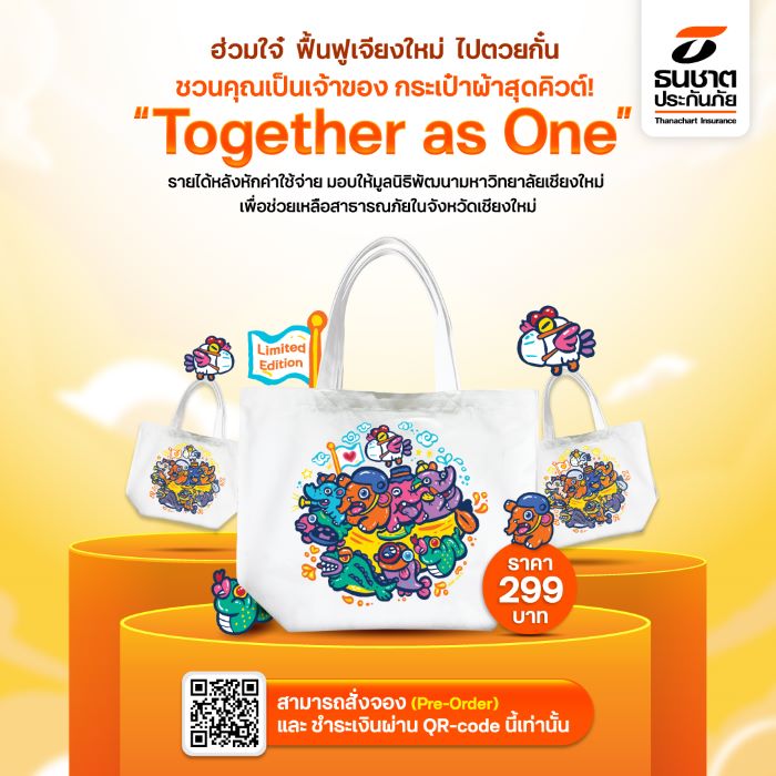 ขอเชิญชวนร่วมกิจกรรม “ฮ่วมใจ๋ ฟื้นฟูเจียงใหม่ ไปตวยกั๋น” สั่งซื้อกระเป๋าผ้า “Together as one” ในราคาใบละ 299 บาท สามารถสั่งจอง (Pre-Order) ได้ผ่าน QR-Code บนช่องทางออนไลน์ของธนชาตประกันภัย ทั้งเว็บไซต์ธนชาตประกันภัย www.thanachartinsurance.co.th และเฟซบุ๊กแฟนเพจ thanachartinsurance – tni หรือคลิกที่ลิงก์นี้ https://bit.ly/3Z3foAg ตั้งแต่วันนี้ – 25 พฤศจิกายน 2567 (ชำระเงินผ่านบัญชีมูลนิธิธนชาตเพื่อสังคมไทย) โดยจะได้รับสินค้าภายในเดือนมกราคม 2568