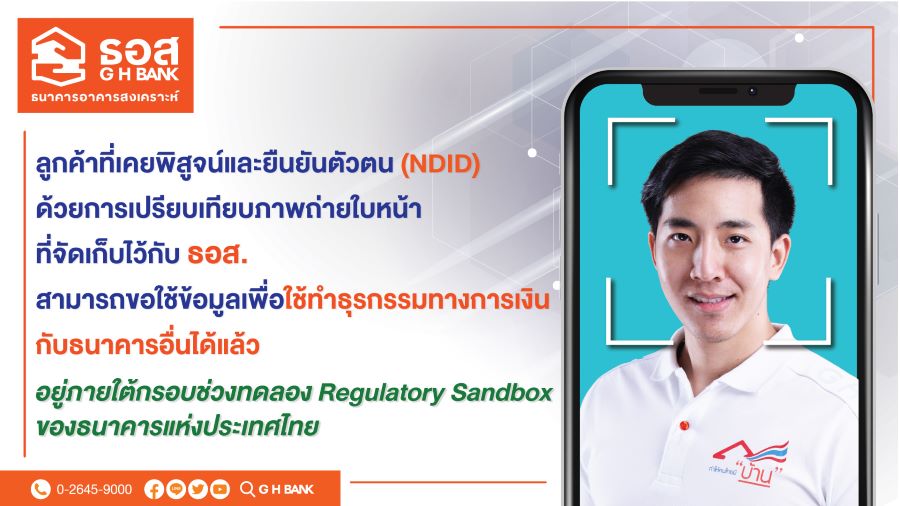 ธนาคารอาคารสงเคราะห์ (ธอส.) พร้อมเข้าร่วมทดสอบการให้บริการเปิดบัญชีเงินฝากออมทรัพย์ผ่านช่องทางดิจิทัล โดยใช้การพิสูจน์และยืนยันตัวตนข้ามธนาคาร ผ่านแพลตฟอร์ม เนชั่นแนลดิจิทัล ไอดี (National Digital ID หรือ NDID) ทางโมบายแอปพลิเคชั่น GHB ALL ของธนาคารอาคารสงเคราะห์ ด้วยเทคโนโลยีชีวมิติ (Biometrics) ตั้งแต่วันที่ 15 มิถุนายน 2564 เป็นต้นไป ซึ่งเป็นช่วงระหว่างที่ร่วมทดสอบใน Regulatory Sandbox ของธนาคารแห่งประเทศไทย (ธปท.) โดยจะช่วยให้ลูกค้าที่เปิดบัญชีเงินฝากออมทรัพย์กับธนาคารอาคารสงเคราะห์ และมีการพิสูจน์และยืนยันตัวตนด้วยการเปรียบเทียบภาพถ่ายใบหน้าที่เคยจัดเก็บไว้กับธนาคารอาคารสงเคราะห์ สามารถแสดงความจำนงขอใช้ข้อมูลที่เคยยืนยันตัวตนกับธนาคารอาคารสงเคราะห์ เพื่อนำไปใช้กับธนาคารอื่นที่ลูกค้าประสงค์จะทำธุรกรรมทางการเงินได้ตั้งแต่วันนี้เป็นต้นไป และให้ลูกค้าประชาชนสามารถเข้าถึงบริการทางการเงินได้สะดวก รวดเร็ว และปลอดภัยมากขึ้นผ่านช่องทางดิจิทัล โดยไม่ต้องเดินทางไปที่สาขาธนาคารภายใต้สถานการณ์ป้องกันความเสี่ยงอันเกิดจากเชื้อไวรัส COVID-19 ทั้งนี้ ลูกค้าสามารถศึกษาขั้นตอนการเปิดบัญชีเงินฝากออมทรัพย์ผ่าน GHB ALL และการพิสูจน์และการยืนยันตัวตนแบบง่ายๆ และรวดเร็วได้ที่เว็บไซต์ของธนาคารอาคารสงเคราะห์ www.ghbank.co.th หรือ สอบถามข้อมูลเพิ่มเติมติดต่อ ศูนย์ลูกค้าสัมพันธ์ ธอส. โทร. 0-2645-9000