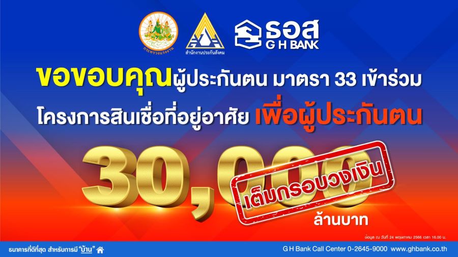 ธนาคารอาคารสงเคราะห์ (ธอส.) เปิดเผยว่า จากการจัดทำ “โครงการสินเชื่อที่อยู่อาศัยเพื่อผู้ประกันตน” สำหรับผู้ประกันตนในระบบประกันสังคม มาตรา 33 ที่ต้องการไถ่ถอนจำนอง (รีไฟแนนซ์) ที่ดินพร้อมอาคาร ห้องชุด (คอนโดมิเนียม) จากสถาบันการเงินอื่น และให้เปลี่ยนอัตราดอกเบี้ยสำหรับผู้ประกันตนที่มีบัญชีเงินกู้กับ ธอส. ให้ได้รับอัตราดอกเบี้ยคงที่ 5 ปีแรก เท่ากับ 1.99% ต่อปี นั้น โดยหลังเปิดให้ขอรับรหัสเข้าร่วมโครงการผ่าน Application : GHB ALL GEN และ GHB  ALL ในช่วงที่ผ่านมา ผลปรากฏว่า มีผู้ประกันตนให้ความสนใจและขอรับรหัสเข้าร่วมโครงการเป็นจำนวนมาก ส่งผลให้วานนี้ (วันที่ 23 พฤษภาคม 2566) มีผู้ประกันตนที่ถึงลำดับคิวเรียกยื่นกู้ได้มาติดต่อยื่นขอสินเชื่อเต็มกรอบวงเงิน 30,000 ล้านบาทแล้ว ธอส. จึงขอปิดรับเรื่องการยื่นขอสินเชื่อดังกล่าว สำหรับลูกค้าที่ได้รับอนุมัติสินเชื่อไปแล้ว ยังสามารถมาดำเนินการทำนิติกรรมสัญญาได้ตามขั้นตอนปกติ ทั้งนี้ ธอส. ขอขอบคุณผู้ประกันตนทุกท่าน ที่ให้ความสนใจเข้าร่วมโครงการดังกล่าว และขออภัยต่อผู้ประกันตนที่ไม่สามารถเข้าร่วมโครงการในครั้งนี้ได้