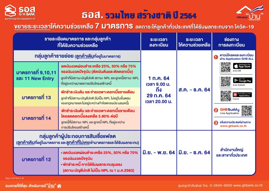 ธนาคารอาคารสงเคราะห์ รับนโยบายรัฐมนตรีว่าการกระทรวงการคลัง ขยายระยะเวลาความช่วยเหลือลูกค้าเดิมที่อยู่ใน 7 มาตรการ และยังได้รับผลกระทบด้านรายได้จาก COVID-19 ออกไปอีกนานสูงสุด 7 เดือน หรือจนถึงวันที่ 31 ธันวาคม 2564 อาทิ แบ่งจ่ายเงินงวดผ่อนชำระ (ตัดต้น ตัดดอก) ขยายระยะเวลาลดเงินงวดผ่อนชำระ และพักชำระหนี้ พักชำระเงินต้น และจ่ายเฉพาะดอกเบี้ยรายเดือน เป็นต้น เริ่มเปิดลงทะเบียนแจ้งความประสงค์เข้าร่วม 6 มาตรการผ่าน Application : GHB ALL หรือ GHB Buddy บน Application Line ได้ตั้งแต่วันที่ 1-29 กรกฎาคม 2564 ส่วนมาตรการที่ 12 ลงทะเบียนได้ที่ทุกสาขาทั่วประเทศ ตั้งแต่เดือนมิถุนายน-พฤศจิกายน 2564