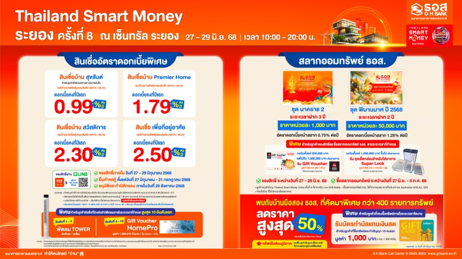 งาน Thailand Smart Money ระยอง ครั้งที่ 8 มีกำหนดจัดขึ้น ณ เซ็นทรัล ระยอง ระหว่างวันที่ 27 – 29 มิถุนายน 2568 ผู้ที่สนใจสามารถสอบถามรายละเอียดเพิ่มเติมได้ที่ ธอส.ทุกสาขาทั่วประเทศ G H Bank Call Center โทร.0-2645-9000 หรือ Facebook Fanpage ธนาคารอาคารสงเคราะห์ และติดตามข่าวสารของธนาคารได้ที่ Application : GHB ALL GEN และ www.ghbank.co.th