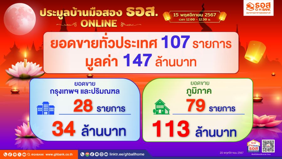 ธอส. ทำให้คนไทยมีบ้านรับสิ้นปี! เผยผลประมูลบ้านมือสองออนไลน์ สามารถจำหน่ายได้ 107 รายการ มูลค่ารวมกว่า 147 ล้านบาท