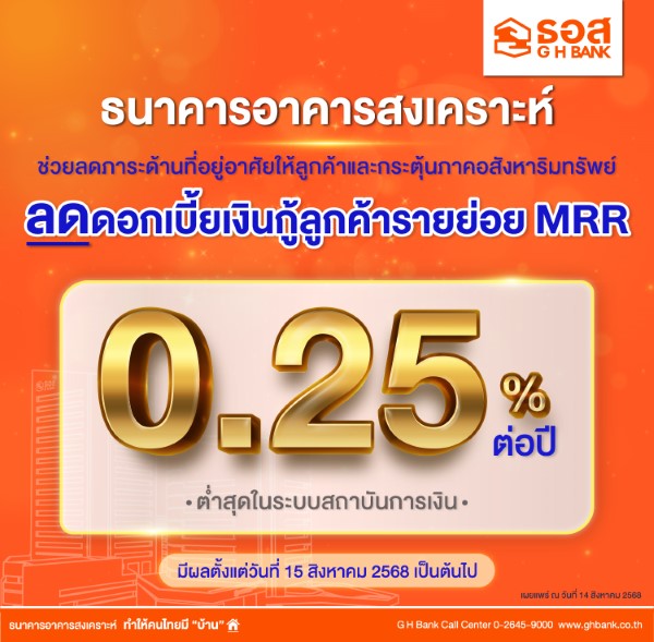 นายกมลภพ วีระพละ กรรมการผู้จัดการธนาคารอาคารสงเคราะห์ (ธอส.) เปิดเผยว่า ตามที่คณะกรรมการนโยบายการเงิน (กนง.) มีมติปรับลดอัตราดอกเบี้ยนโยบาย 0.25% ต่อปี จาก 1.75% ต่อปี เป็น 1.50% ต่อปี เมื่อวันที่ 13 สิงหาคม 2568 ธอส. พร้อมเป็นส่วนหนึ่งในการช่วยลดภาระด้านที่อยู่อาศัยให้ลูกค้าและขับเคลื่อนภาคอสังหาริมทรัพย์ของประเทศ จึงปรับลดอัตราดอกเบี้ยเงินกู้ลูกค้ารายย่อยชั้นดี (MRR) 0.25% ต่อปี จากปัจจุบัน 6.495% ต่อปี เป็น 6.245% ต่อปี โดยให้มีผลตั้งแต่วันที่ 15 สิงหาคม 2568 เป็นต้นไป ส่งผลให้ปัจจุบันอัตราดอกเบี้ย MRR ของ ธอส. ยังคงอยู่ในระดับต่ำสุดเมื่อเทียบกับธนาคารพาณิชย์และสถาบันการเงินของรัฐอื่น