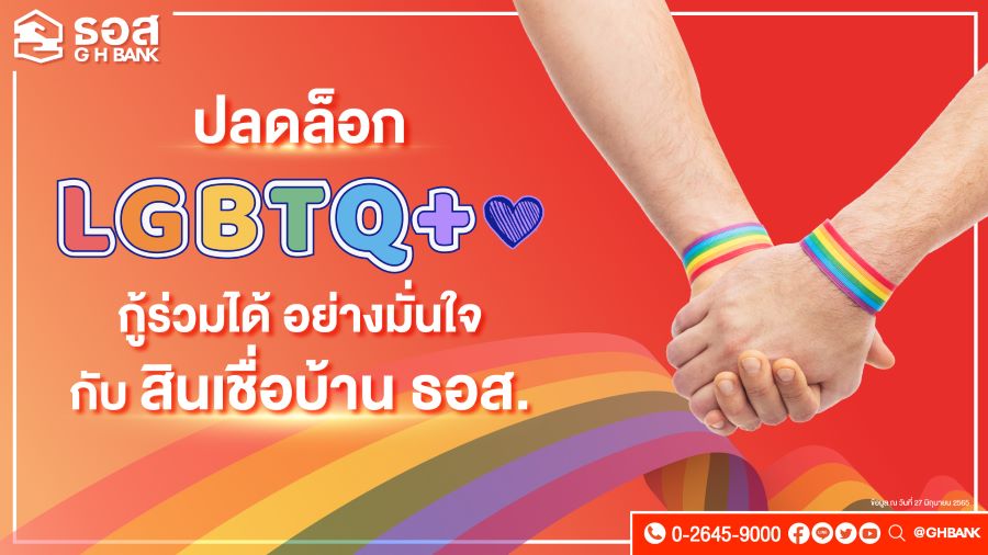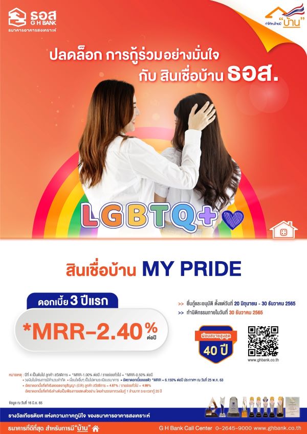 ธนาคารอาคารสงเคราะห์ (ธอส.) ส่งเสริมสิทธิเสรีภาพและความเท่าเทียมทางเพศในสังคมไทย สนับสนุนให้กลุ่มบุคคลที่มีความหลากหลายทางเพศ (LGBTQ+) สามารถมีที่อยู่อาศัยเป็นของตนเองได้ง่ายยิ่งขึ้นตามพันธกิจ “ทำให้คนไทยมีบ้าน” เพื่อความสุข ความมั่นคง และคุณภาพชีวิตที่ดีของตนเองและคนในครอบครัว ล่าสุด ธอส. จึงได้ปรับปรุงเงื่อนไขในการให้สินเชื่อของธนาคาร โดยกำหนดให้กลุ่มบุคคลที่มีความหลากหลายทางเพศ (LGBTQ+) สามารถกู้ร่วมกันได้แล้วตั้งแต่บัดนี้เป็นต้นไป ครอบคลุมทุกผลิตภัณฑ์สินเชื่อ เช่นเดียวกับกรณี กู้ร่วมกับคู่สมรส พี่-น้อง และบิดา-มารดา ขณะเดียวกันยังได้เพิ่มทางเลือกในด้านสินเชื่อ เปิดตัวผลิตภัณฑ์ใหม่ สินเชื่อบ้าน MY PRIDE อัตราดอกเบี้ย 3 ปีแรกเท่ากับ MRR-2.40% ต่อปี ปัจจุบันเท่ากับ 3.75% ต่อปี (คิดจากอัตราดอกเบี้ย MRR ตามประกาศธนาคาร ปัจจุบัน MRR เท่ากับ 6.150% ต่อปี) ปีที่ 4 จนถึงตลอดอายุสัญญาเงินกู้อัตราดอกเบี้ยเป็นไปตามที่ธนาคารกำหนด ให้กู้สำหรับลูกค้าทั่วไปและลูกค้าที่มีสวัสดิการเงินกู้กับธนาคารเพื่อซื้อบ้าน ห้องชุด (คอนโดมิเนียม) หรือที่ดินเปล่าที่เป็นทรัพย์มือสองของธนาคาร ผ่อนชำระได้นานสูงสุด 40 ปี ยื่นคำขอกู้ และทำนิติกรรมได้แล้วถึงวันที่ 30 ธันวาคม 2565