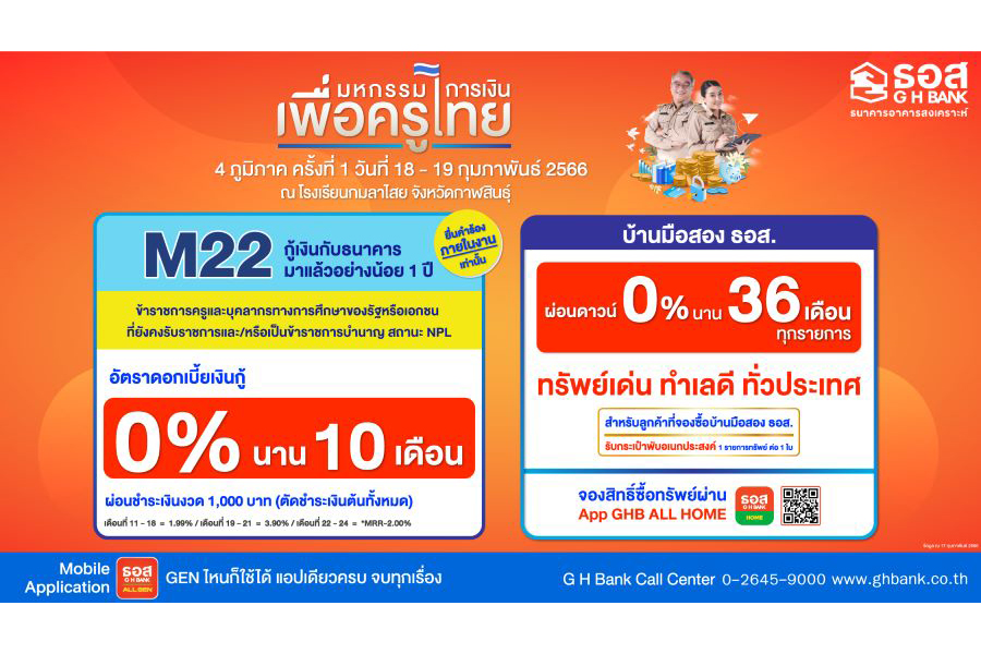 นายฉัตรชัย ศิริไล กรรมการผู้จัดการ ธนาคารอาคารสงเคราะห์ (ธอส.) เปิดเผยว่า เพื่อดำเนินการตามนโยบายของรัฐบาล ในการแก้ไขปัญหาหนี้สินให้กับประชาชน ธอส. ในฐานะสถาบันการเงินของรัฐ ที่มีพันธกิจ “ทำให้คนไทยมีบ้าน” จึงสานต่อความช่วยเหลือดังกล่าว ไปยังข้าราชการครูและบุคลากรทางการศึกษา ที่ถือเป็นทรัพยากรบุคคลที่สำคัญในการพัฒนาด้านการศึกษาของประเทศให้มีคุณภาพชีวิตที่ดีขึ้น ผ่านการแก้ไขปัญหาหนี้สิน ทั้งที่อยู่ระหว่างการเข้าสู่กระบวนการไกล่เกลี่ย และการปรับโครงสร้างหนี้ ด้วยการนำมาตรการแก้หนี้และผลิตภัณฑ์ทางการเงินเข้าร่วมงานมหกรรมการเงินเพื่อครูไทย 4 ภูมิภาค ที่จัดขึ้นโดยกระทรวงศึกษาธิการ ร่วมกับสถาบันการเงินของรัฐ สหกรณ์ออมทรัพย์ครูและหน่วยงานที่เกี่ยวข้อง เพื่อให้ข้าราชการครูและบุคลากรทางการศึกษาทุกภูมิภาคทั่วประเทศให้ได้รับความช่วยเหลืออย่างครบวงจร โดยการจัดงานครั้งที่ 1 จัดขึ้นระหว่างวันที่ 18-19 กุมภาพันธ์ 2566 ณ โรงเรียนกมลาไสย จ.กาฬสินธุ์ โดย ธอส. นำมาตรการแก้หนี้และผลิตภัณฑ์ทางการเงินเข้าร่วมงาน ประกอบด้วย