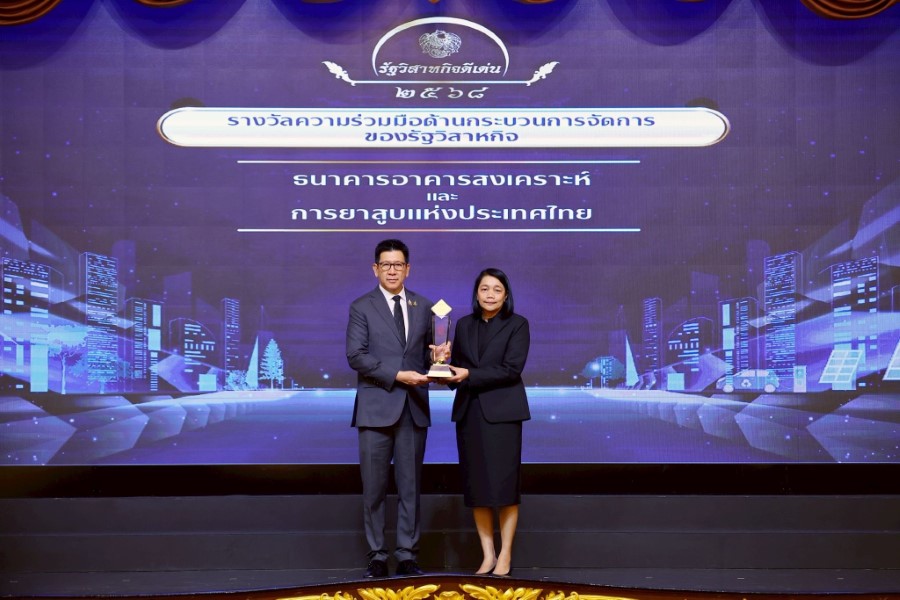 3. รางวัลความร่วมมือด้านกระบวนการจัดการของรัฐวิสาหกิจ ประเภทรางวัลดีเด่น จากโครงการความร่วมมือด้านกระบวนการจัดการของรัฐวิสาหกิจ ระหว่างธนาคารอาคารสงเคราะห์ (ธอส.) และการยาสูบแห่งประเทศไทย (ยสท.) ซึ่งรางวัลดังกล่าวเป็นการดำเนินการตามโครงการคู่ความร่วมมือของรัฐวิสาหกิจตามนโยบายที่ สคร. กำหนดอย่างต่อเนื่อง โดยในปี 2568 ธอส. และ ยสท. ได้เพิ่มการแลกเปลี่ยนเรียนรู้ร่วมกันผ่าน 3 เรื่องสำคัญ ได้แก่ 1) แผนการดำเนินงาน Core Business Enablers 2) การแลกเปลี่ยนเรียนรู้ (Knowledge Sharing) และ 3) การแบ่งปันทรัพยากร (Resource Sharing) ระบบ Operational Risk Management System (ORMS) ของ ธอส. เพื่อเพิ่มประสิทธิภาพด้านการบริหารความเสี่ยงและควบคุมภายในให้แก่ ยสท. ให้มีเครื่องมือในการยกระดับมาตรฐานการบริหารจัดการความเสี่ยงได้ทั่วทั้งองค์กร ซึ่งจากการดำเนินการร่วมกันส่งผลให้คะแนนผลลัพธ์ด้าน Core Business Enablers ของ ยสท. เพิ่มขึ้นอย่างมีนัยสำคัญ นำไปสู่การพัฒนาขีดความสามารถที่ยั่งยืนในระยะยาวอย่างเป็นรูปธรรม