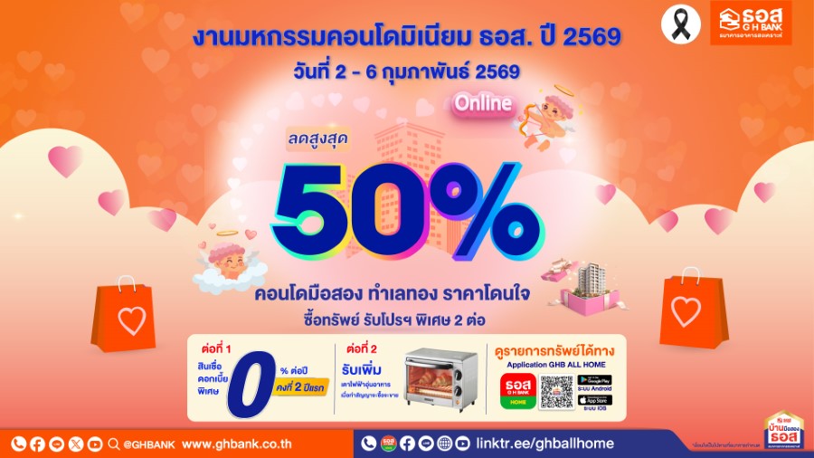 ธนาคารอาคารสงเคราะห์ (ธอส.) รุกตลาดอสังหาริมทรัพย์มือสองรับต้นปี จัดมหกรรมคอนโดมิเนียม ธอส. ปี 2569 (Online) นำทรัพย์เด่น ทำเลทองกว่า 600 รายการ ลดราคาสูงสุด 50% จากราคาปกติ พร้อมโปรโมชันพิเศษ 2 ต่อ !!
