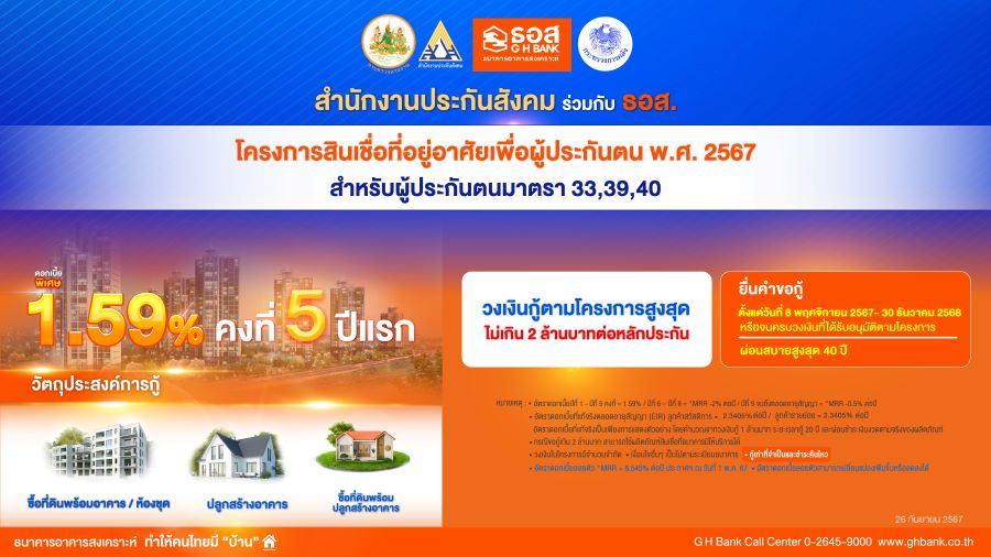 ธนาคารอาคารสงเคราะห์ (ธอส.) ร่วมกับ สำนักงานประกันสังคม ลงนามบันทึกข้อตกลงความร่วมมือ (MOU) จัดทำโครงการสินเชื่อที่อยู่อาศัยเพื่อผู้ประกันตน พ.ศ. 2567 กรอบวงเงิน 10,000 ล้านบาท ปล่อยสินเชื่ออัตราดอกเบี้ยต่ำ 5 ปีแรก เพียง 1.59% ต่อปี ให้กับผู้ประกันตนตามมาตรา 33, 39 หรือ 40 ที่ต้องการซื้อ หรือปลูกสร้างที่อยู่อาศัย ผ่อนคงที่นาน 5 ปี กรณีกู้ 1 ล้านบาท ผ่อนชำระเงินงวดเพียง 3,400 บาท เท่านั้น ผู้ที่สนใจสามารถลงทะเบียนขอหนังสือรับรองสถานะความเป็นผู้ประกันตนจากสำนักงานประกันสังคม ได้ตั้งแต่วันที่ 1 พฤศจิกายน 2567 เป็นต้นไป เพื่อนำมาประกอบการยื่นขอสินเชื่อที่ ธอส. ทุกสาขาทั่วประเทศ ตั้งแต่วันที่ 8 พฤศจิกายน 2567 ถึงวันที่ 30 ธันวาคม 2568 หรือก่อนกำหนดระยะเวลาดังกล่าว หาก ธอส.ให้สินเชื่อเต็มกรอบวงเงินโครงการแล้ว