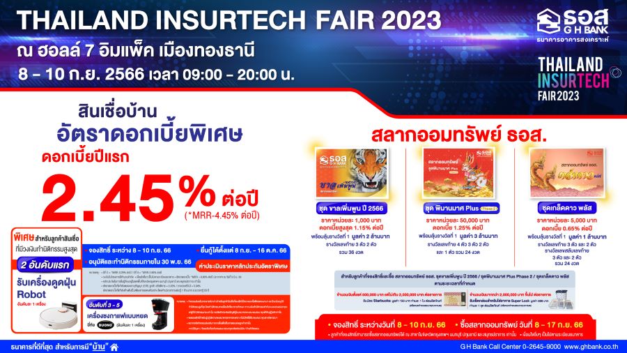 ธนาคารอาคารสงเคราะห์ (ธอส.) จัดโปรโมชันร่วมงานมหกรรมประกันภัยสุดยิ่งใหญ่แห่งปี “THAILAND INSURTECH FAIR 2023” เพิ่มโอกาสให้คนไทยได้เข้าถึงผลิตภัณฑ์ทางการเงินของธนาคารมากขึ้น นำโดยสินเชื่อบ้านอัตราดอกเบี้ยพิเศษปีแรกเท่ากับ MRR-4.45% ต่อปี (ปัจจุบันเท่ากับ 2.45% ต่อปี) เฉลี่ย 3 ปีแรกเพียง 3.45% (อัตราดอกเบี้ย MRR ของ ธอส.ในปัจจุบันเท่ากับ 6.90% ต่อปี) ค่าประเมินราคาหลักประกันอัตราพิเศษ ผ่อนชำระนานสูงสุดถึง 40 ปี ให้กู้ครอบคลุมทุกวัตถุประสงค์หลัก อาทิ ซื้อบ้าน/คอนโดมิเนียม ปลูกสร้างและรีไฟแนนซ์ โดยหลักประกันในการยื่นคำขอกู้ต้องอยู่ในพื้นที่จังหวัดกรุงเทพฯ นนทบุรี ปทุมธานี และสมุทรปราการเท่านั้น จองสิทธิ์ภายในงาน ยื่นกู้ตั้งแต่วันที่ 8 กันยายน – 16 ตุลาคม 2566 และทำนิติกรรมภายในวันที่ 30 พฤศจิกายน 2566 พิเศษ!! สำหรับลูกค้าสินเชื่อที่มีวงเงินทำนิติกรรมสูงสุด 5 อันดับแรก รับของสมนาคุณฟรี ดังนี้ วงเงินสูงสุดอันดับที่ 1 – 2 รับเครื่องดูดฝุ่น Robot และอันดับที่ 3 – 5 รับเครื่องชงกาแฟแบบหยดจาก Buono
