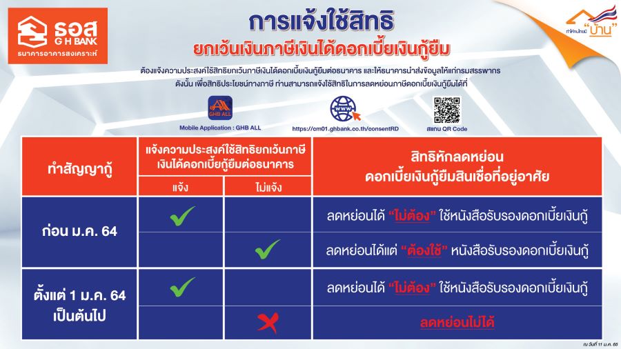 ทั้งนี้ สำหรับลูกค้าที่ทำสัญญากู้เงินตั้งแต่วันที่ 1 มกราคม 2564 เป็นต้นไป ที่ต้องการนำค่าใช้จ่ายจากการชำระดอกเบี้ยเงินกู้ยืมสินเชื่อเพื่อที่อยู่อาศัย มาใช้สิทธิลดหย่อนภาษีดอกเบี้ยเงินกู้ยืมฯ ในรอบปีภาษี 2564 เป็นต้นไป ต้องแจ้งใช้สิทธิเพื่อลดหย่อนภาษีเงินได้ดอกเบี้ยเงินกู้ยืมฯ และยินยอมให้ธนาคารนำส่งข้อมูลให้แก่กรมสรรพากร โดยสามารถแจ้งการใช้สิทธิดังกล่าวได้ ผ่านทาง Application : GHB ALL เพียงเลือกแถบเมนู ที่มุมซ้ายด้านล่าง กดที่ “บริการอื่น ๆ” เลือก “หนังสือรับรองดอกเบี้ยเงินกู้/แจ้งสิทธิยกเว้นภาษี” จากนั้นเลือก “แจ้งใช้สิทธิยกเว้นภาษีเงินได้ดอกเบี้ยเงินกู้ยืม” และกดตกลง หรือ ผ่านทางเว็บไซต์ธนาคารที่ https://cm01.ghbank.co.th/consentRD หรือ สแกน QR Code สำหรับลูกค้าที่ดำเนินการตามขั้นตอนข้างต้นแล้ว จะสามารถใช้สิทธิหักลดหย่อนภาษีดอกเบี้ยเงินกู้ยืมฯ ได้โดยไม่ต้องใช้หนังสือรับรองดอกเบี้ยจากธนาคารอีก เนื่องจากกรมสรรพากรสามารถใช้ข้อมูลที่ธนาคารนำส่งไปประกอบการใช้สิทธิลดหย่อนภาษีของลูกค้าได้สอบถามข้อมูลเพิ่มเติม หรือ ติดตามข้อมูลข่าวสารของธนาคารได้ที่ www.ghbank.co.th หรือศูนย์ลูกค้าสัมพันธ์(Call Center) โทร 0-2645-9000 หรือ Facebook Fanpage ธนาคารอาคารสงเคราะห์ และ Application : GHB ALL
