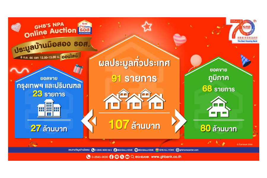 ธนาคารอาคารสงเคราะห์ (ธอส.) เปิดเผยผลการจัด “งานประมูลขายบ้านมือสองออนไลน์ GHB’S NPA Online Auction” ผ่าน Application : GHB ALL HOME” ที่จัดขึ้นในวันศุกร์ที่ 8 กันยายน 2566 ระหว่างเวลา 12.00-13.00 น. ทั่วประเทศ สามารถจำหน่ายบ้านมือสองได้จำนวน 91 รายการ คิดเป็นมูลค่ากว่า 107 ล้านบาท แบ่งเป็นทรัพย์ที่ตั้งอยู่ในพื้นที่กรุงเทพฯ และปริมณฑล จำนวนกว่า 23 รายการ และในส่วนภูมิภาค 68 รายการ โดยรายการทรัพย์ที่ประมูลได้ในราคาต่ำที่สุดเพียง 100,000 บาท ได้แก่ ห้องชุด ขนาดเนื้อที่ 23.63 ตารางเมตร ใน อ.บางพลี จ.สมุทรปราการ ขณะที่ทรัพย์ที่ประมูลในราคาสูงสุด ได้แก่ บ้านเดี่ยว 68.10 ตารางวา ใน อ.เมืองภูเก็ต จ.ภูเก็ต ในราคา 5.05 ล้านบาท เนื่องจากเป็นทรัพย์ที่มีขนาดเนื้อที่กว้างขวาง อยู่ใจกลางแหล่งท่องเที่ยว และเดินทางสะดวกสบาย