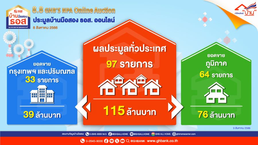 ธนาคารอาคารสงเคราะห์ (ธอส.) รายงานผลการประมูลบ้านมือสอง ธอส. ออนไลน์ 8.8 GHB’s NPA Online Auction ผ่าน Application : GHB ALL HOME จัดขึ้นวานนี้ (8 สิงหาคม 2566) พร้อมกันทั่วประเทศ ระหว่างเวลา 12.00 – 13.00 น. โดยภายในระยะเวลาประมูลเพียง 1 ชั่วโมง สามารถจำหน่ายทรัพย์ NPA ได้จำนวนทั้งสิ้น 97 รายการ คิดเป็นมูลค่าที่จำหน่ายได้รวม 115 ล้านบาท แบ่งเป็นทรัพย์ที่ตั้งอยู่ในพื้นที่กรุงเทพฯ และปริมณฑล จำนวน 33 รายการ คิดเป็นมูลค่า 39 ล้านบาท และทรัพย์ในส่วนภูมิภาค จำนวน 64 รายการ คิดเป็นมูลค่า 76 ล้านบาท โดยทรัพย์ที่ประมูลขายได้ในราคาสูงสุด ได้แก่ ทรัพย์ประเภทบ้านเดี่ยว 2 ชั้น ขนาดเนื้อที่ 130.1 ตารางวา ใน อ.เมืองอุบลราชธานี จ.อุบลราชธานี สามารถจำหน่ายได้ในราคา 2.9 ล้านบาท เนื่องจากเป็นทรัพย์ที่มีพื้นที่ใช้สอยจำนวนมาก เหมาะแก่การอยู่อาศัยเป็นอย่างมาก ส่วนทรัพย์ที่ประมูลขายได้ในราคาต่ำสุด ได้แก่ ทรัพย์ประเภทห้องชุด (คอนโดมิเนียม) ขนาดเนื้อที่ 25.84 ตารางเมตร ในเขตบางเขน กรุงเทพฯ จำหน่ายได้ในราคา 1.7 แสนบาท เท่านั้น