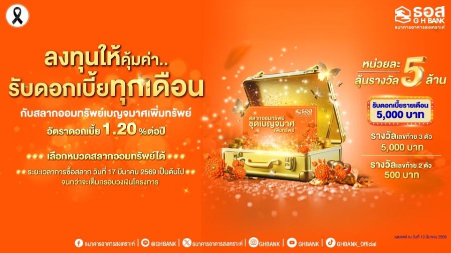 ธนาคารอาคารสงเคราะห์ (ธอส.) สนับสนุนการออม สร้างความมั่นคงในชีวิต เพิ่มทางเลือกการลงทุนที่ให้ผลตอบแทนคุ้มค่า กับ “สลากออมทรัพย์ ธอส. ชุดเบญจมาศเพิ่มทรัพย์” อัตราดอกเบี้ยหน้าสลาก 1.20% ต่อปี โดยรับเป็นรายเดือน เดือนละ 5,000 บาท พร้อมลุ้นรับรางวัลใหญ่ตลอด 12 งวด ผู้ที่สนใจสามารถซื้อสลากได้ตั้งแต่วันที่ 17 มีนาคม 2569 เป็นต้นไป ณ สาขาธนาคารทั่วประเทศ