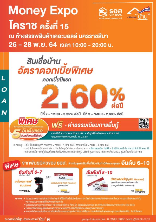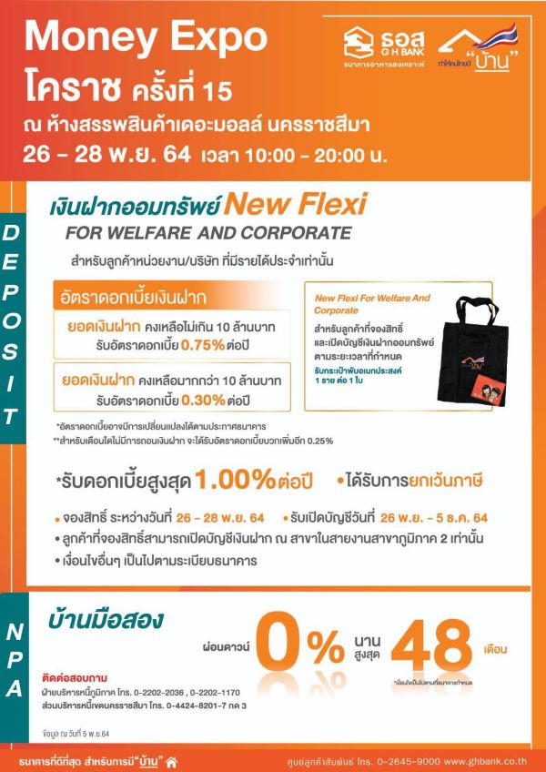 ธนาคารอาคารสงเคราะห์ (ธอส.) ร่วมงาน Money Expo Korat 2021 มหกรรมการเงินโคราช ครั้งที่ 15 ระหว่างวันที่ 26-28 พฤศจิกายน 2564 ณ ห้างสรรพสินค้าเดอะมอลล์ นครราชสีมา นำผลิตภัณฑ์ทางการเงินพิเศษมากมายนำเสนอให้กับประชาชนในจังหวัดนครราชสีมา และพื้นที่ใกล้เคียง นำโดยสินเชื่อบ้านอัตราดอกเบี้ยพิเศษ คงที่ปีแรก 2.60% ต่อปี ฟรีค่าธรรมเนียมการยื่นกู้ ด้านเงินฝากพบกับเงินฝากออมทรัพย์ New Flexi for Welfare and Corporate อัตราดอกเบี้ยสูงสุด 1.00% ต่อปี และยังคัดบ้านมือสอง หรือ GHB NPA คุณภาพดี ทำเลเด่นหลากหลายประเภทในจังหวัดนครราชสีมา และพื้นที่ใกล้เคียงจำนวน 400 รายการ มาจำหน่ายในราคาพิเศษ พร้อมส่วนลดสูงสุดถึง 40% จากราคาปกติ ราคาต่ำสุดเพียง 125,000 บาท ให้ผ่อนดาวน์อัตราดอกเบี้ย 0% นานสูงสุดถึง 48 เดือน
